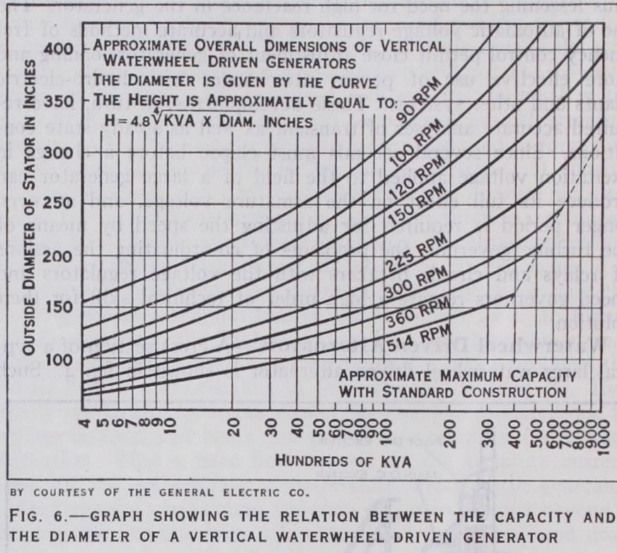 The diagram (fig. 6) shows curves enabling the approximate dimensions of a waterwheel generator for any given speed and out put to be determined. The diagram shows specifically the relation between capacity and diameter of a vertical type generator. The efficiencies of modern generators of this type are very high, all except very small ones being above 95% and some reaching 98%. The advent of the Kaplan propeller type turbine with ad justable pitch blades has encouraged the development of lower head projects by enabling a somewhat higher generator speed to be used for a given fall of water. These wheels have higher run away speeds, requiring generators to withstand 25o or even 280% of normal speed, instead of 200 to 225% runaway speeds typical of older fixed blade turbines. There has also been a tendency to increased hydraulic thrust values. The Dnieprostroy genera tor thrust bearings have a capacity of 2,000,000 pounds, while the 6o.000 kv-a., 75 r.p.m., Bonneville generator bearings are able to carry 3,000,00o pounds.