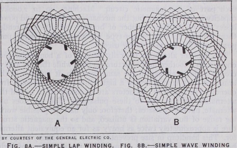 In mechanical construction, any generator can be made with a horizontal or a vertical shaft, with radial (disc type) or axial conductor arrangement, and with the field inside or outside of the armature. The most usual construction has a horizontal shaft, with axial conductors, and outside armature. Exceptions are type f machines, which have the armature inside, and type b machines, which are now commonly made with vertical shafts. Of the various types, the engine-driven continuous current gen erator (c, f) was the most important before 1900, in the days of the reciprocating steam engine, and the recent Diesel engine progress is bringing it renewed prominence for marine and railway locomotive power plants, especially tugboats and switching en gines. The development of the electric transformer and the steam turbine brought type a, e into the lead about 1905, and improve ments in power transmission have made type b, e important also. Efficient gas and oil engines, notably the Diesel engine, have brought type c, e into prominence too. The advantages in alter nating current power generation and transmission have made it common to produce direct current power, when required, by con version from alternating current power, so that direct current gen erators are now most frequently of type d, f. Other types of generator are of minor importance in the production of primary electric power, 'though useful in special applications, as d, h for the production of high frequency alternating currents. Any generator can be used as an electric motor (q.v.), but in practice only types e, f and g are so used. An intermediate variety of machines much used is the synchronous condenser, really an electrically driven synchronous generator of reactive power, or a generator of type d, e, in which the driving motor and the gen erator are combined into a single machine. Such a machine draws from a system a very small energy current and returns to it a large magnetizing current. Another important intermediate variety of machine is the "synchronous converter," which is really the combination of a generator of type d, f with a syn chronous driving motor. By building a synchronous motor as shown in fig. 1, with revolving armature and a direct current gen erator with common windings, the incoming and outgoing arma ture currents can be made largely to cancel each other, so that a greatly increased output can be secured from a given amount of material. A large proportion of all the direct current power now generated is produced by such converters, although mercury arc rectifiers are preferred for most new installations.
