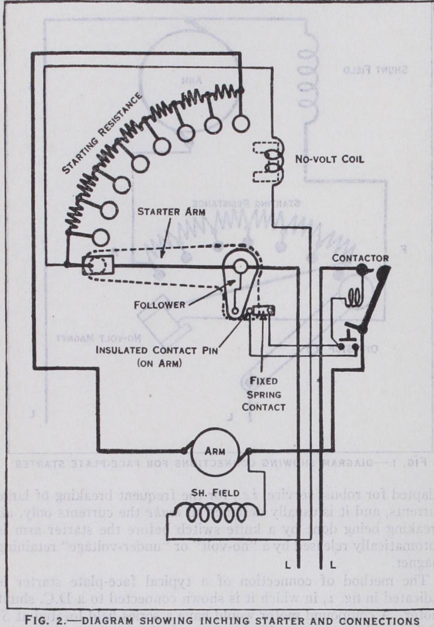The method of connection of a typical face-plate starter is indicated in fig. I, in which it is shown connected to a D.C. shunt motor. A compound motor would have a series field located at S, while a series motor would only have the latter, the lead that in cludes the shunt winding in the figure being omitted and the no volt coil connected across the line in series with an appropriate resistance. A more elaborate face-plate starter arrangement is shown in fig. 2.