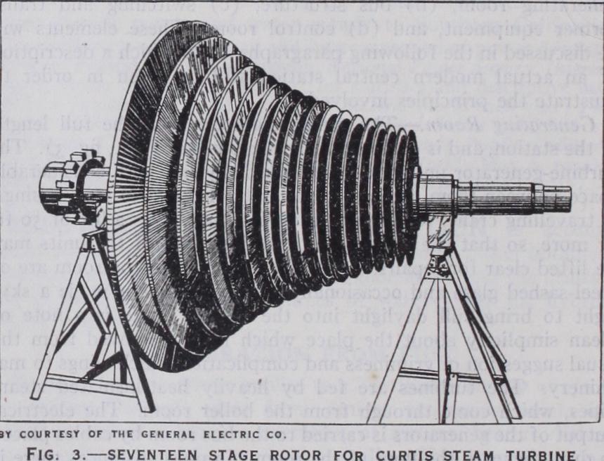 Development.—In the United States the steam turbine gen erates about 6o% of the total electric power, while most of the remainder is derived from water-power (see below under "Hydro electric Generation") . In other countries the ratio is differ ent, depending upon the available supply of commercially useful hydraulic energy and upon relative fuel costs. In the early steam station reciprocating engines were used exclusively, and the power was generated by direct-current dynamos. At about 10,0oo h.p. both the reciprocating steam engine and the direct-current ma chine reached their practical limit of size, and a serious question arose as to how the output could be increased at reasonable cost. Engineers then turned their attention to the steam turbine, which Parsons in England had used successfully in 1897 to drive a British naval destroyer. In 1903 a Curtis turbine was installed at the plant of the Chicago Edison Company and there success fully drove a generator of 5,000 kilowatts (6,70o h.p.) capacity. The problem of greatly increased power in less space was thus solved by the turbine, which was even then as efficient as the reciprocating engine. The use of alternating current, also, made possible the economical transmission of power over considerable distance, thus bringing electric service to communities far from the generating point. Since 1903 both turbines and generators have been greatly improved in design, until to-day single units of 280,000 horsepower are practicable and have been built. (See ELECTRIC GENERATOR.) In general no limit to capacity can be set. Economic considerations lead to generating units of very large capacity, few in number, rather than to many small ma chines, but in each case the local conditions determine just how large a single machine should be. Every central generating station is an individual case, and its design depends upon local conditions, such as amount and character of land available, kind of fuel. source of condenser cooling water, and the kind of electrical load served. In addition to steam generating equipment (see STEAM GENERATION, BOILERS), stations are structurally divided into (a) generating room, (b) bus structure, (c) switching and trans former equipment, and (d) control room. These elements will be discussed in the following paragraphs, after which a description of an actual modern central station will be given in order to illustrate the principles involved.