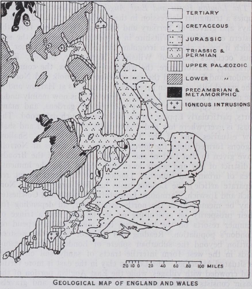 The London Basin and East Anglia.—The London basin oc cupies a triangular depression in the Chalk which is filled up with clays and gravels of Tertiary and later age. It extends from the eastern extremity of Wiltshire in a widening triangle to the sea, which it meets along an irregular line from Deal to Cromer. It thus occupies parts of Wiltshire, Hampshire, Surrey, Kent, Berkshire, Hertfordshire, the whole of Middlesex, the county of London and Essex, and the eastern edge of Suffolk and Norfolk. The gravel hills are often prominent features, as at Harrow and in the northern suburbs of London ; the country is now mainly under grass or occupied with market and nursery gardens, and many parts, particularly Epping forest, still retain much oak wood. The coast is everywhere low and deeply indented by ragged and shal low estuaries, that of the Thames being the largest. Shallow lagoons formed along the lower courses of the rivers of Norfolk have given to that part of the country the name of the Broads, a district of low and nearly level land. Apart from the immense area of urban and suburban London (for its development see separate article) the London basin has few large towns. Nor wich and Ipswich, Yarmouth, Lowestoft, Harwich and Colchester may be mentioned in the north-eastern part, all depending for their prosperity on agriculture or on the sea; and a fringe of summer resorts on the low coast has arisen which depend on London's population. Reading and Windsor lie in the western portion beyond the suburban sphere of London. The Bagshot beds in the west form infertile tracts of sandy soil on which is situated Aldershot. The London clay in the east is more fertile and crowded with villages, while the East Anglian portion of the basin consists of the more recent Pliocene sands and gravels, which mix with the boulder clay to form the best wheat-growing soil in the country. This country appears to have had agricul tural associations from the Bronze Age times and even at that time there was a long tradition of human settlement. Mediaeval contacts with the Flemish weavers over the North sea gave an impetus to the East Anglian woollen trade. Foodstuffs were also exported thither and before the days of coal East Anglia was one of the most important industrial and most populous regions of England. Rural beauty called forth some of England's greatest landscape painters, while centuries of contact with the Continent and especially with Flemish weavers, both traders and artisans, gave her people a broad vision in agricultural, economic, political and religious life, a factor that has to be considered when we remember the part she has played at im portant crises in the history of England.