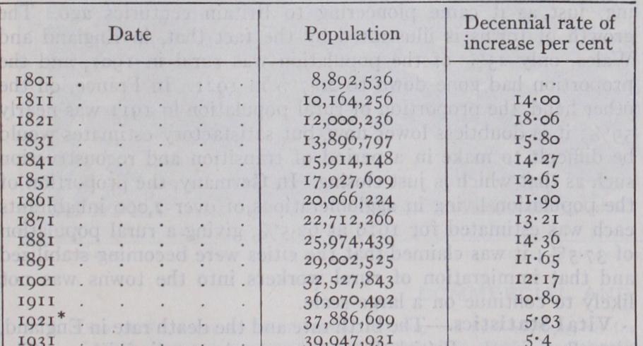 The population of England and Wales at the decades was : *The World War of 1914-18 makes the figure for 1911-21 of less value for comparisons.