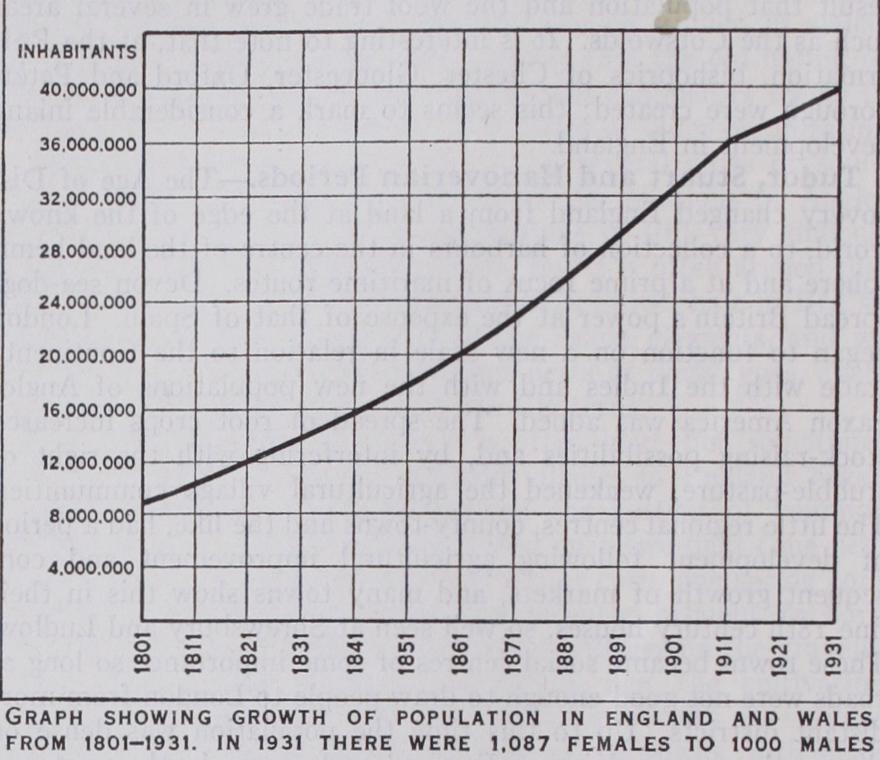 In 1931 the distribution on a county basis in England was :— (Those in italics are not complete counties.) Population and Vital Statistics.—Thus, during the 19th century, the face of England was changed. Regions of relatively dense population in 1800 (excluding London) were regions of relatively sparse population by 1900, less because of local decline than because of immense growth in the coal fields. The present (1 931) distribution shows five great centres of dense population —south Lancashire, of which Manchester and Liverpool are the centres; Northumberland, with Newcastle as focus; the West Riding of Yorkshire around Leeds and Sheffield ; the Midlands, with Birmingham as centre ; and the region of Greater London. During the century the population of England and Wales had in creased from 8,750,000 to 32,500,000. The total population had reached 39,947,931 in 1931.