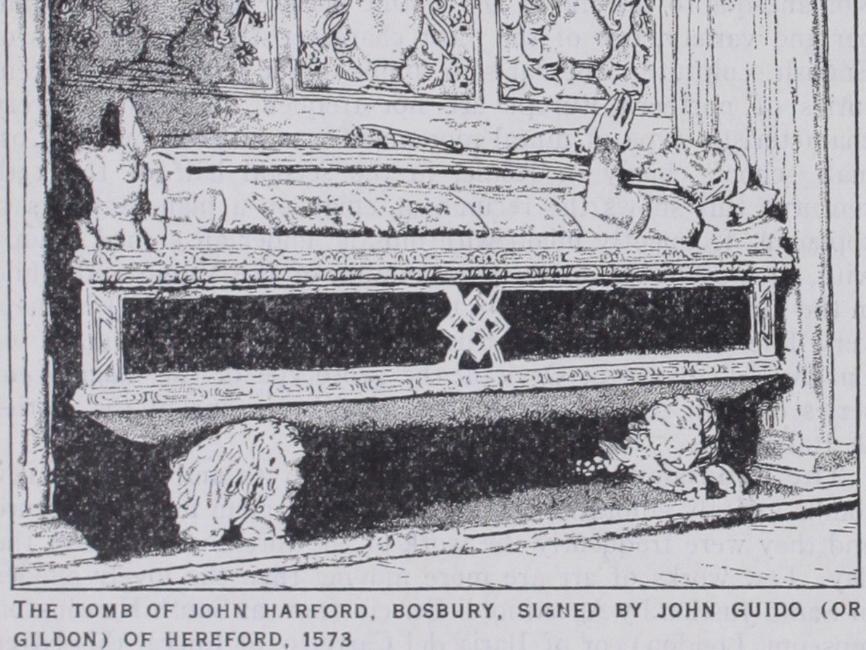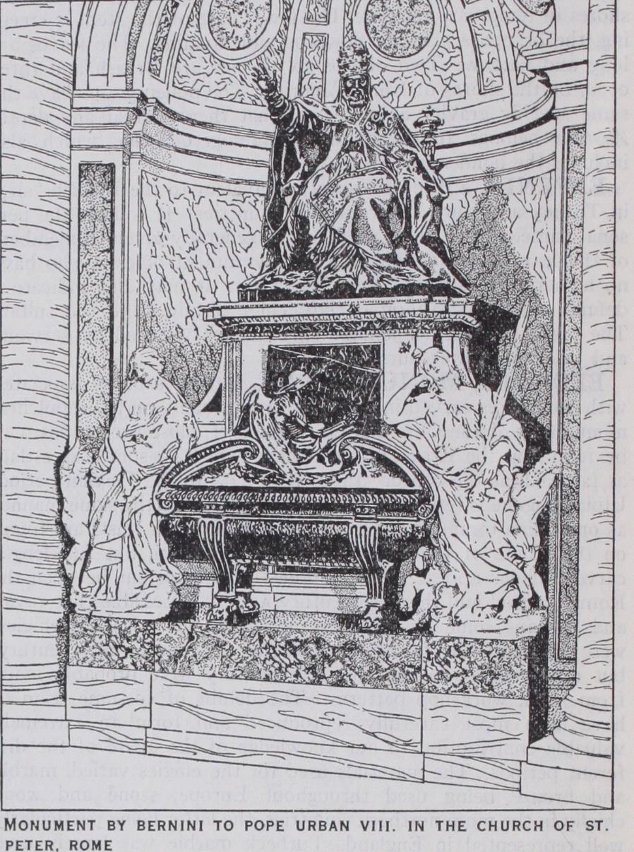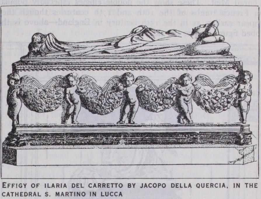 Flat slab monuments are perhaps the most characteristic form throughout the Gothic period in Germany, those of the 14th century being well represented at Bamberg, and there is a long series of effigies, extending over several centuries, at Mainz. Slab tombs of the 12th century in France generally follow the same lines as in Germany but are much more rare. The ments of the 13th and 14th centuries follow the usual develop ment, the effigy being treated in increasingly high relief and fre quently supported on a tomb chest with or without an architec tural canopy. Unfortunately the unrivalled series of royal effigies at St. Denis have suffered severely from restoration but they still form a most valuable record. The few remaining 12th century tombs in England are of the usual slab form with the figure in low relief, but the series of effigies of the 13th century, mainly carved in Purbeck marble, are exceptionally rich in quantity and vigorous in style. A distinct group of effigies is that representing knights in chain-mail; after the middle of the century the legs are usually crossed but there seems to be no foundation for the popular theory that this position indicates a crusader. A notable group of such effigies is in the Temple church in London. Another fine example is the wooden effigy, at Gloucester, called Robert, Duke of Normandy (c. 129o). After the middle of the century miniature chapels and shrines were frequently built up over the tomb, a good example being the monument of Bishop Giles Brid port at Salisbury. The whole series of effigies, from the late Romanesque to the end of the Gothic period form, both in num ber and variety, one of the most characteristic developments of English sculpture. The flat slab tombs of the 12th and 13th cen turies of northern Europe are not frequent in Italy. A very characteristic type of mural monument was evolved by the Cos mati school, chiefly in Rome, in the second half of the 13th century; this shows the recumbent effigy on a high draped sar cophagus, frequently inlaid with mosaic, under an arched canopy with, in most cases, a fresco or mosaic of the Virgin and Child in the lunette. But to Arnolfo di Cambio (c. 1232-1300) is due a very fine development of this composition, the monument of Cardinal de Braye at Orvieto, the prototype of the magnificent series of 15th century monuments, which are one of the glories of Italian art.