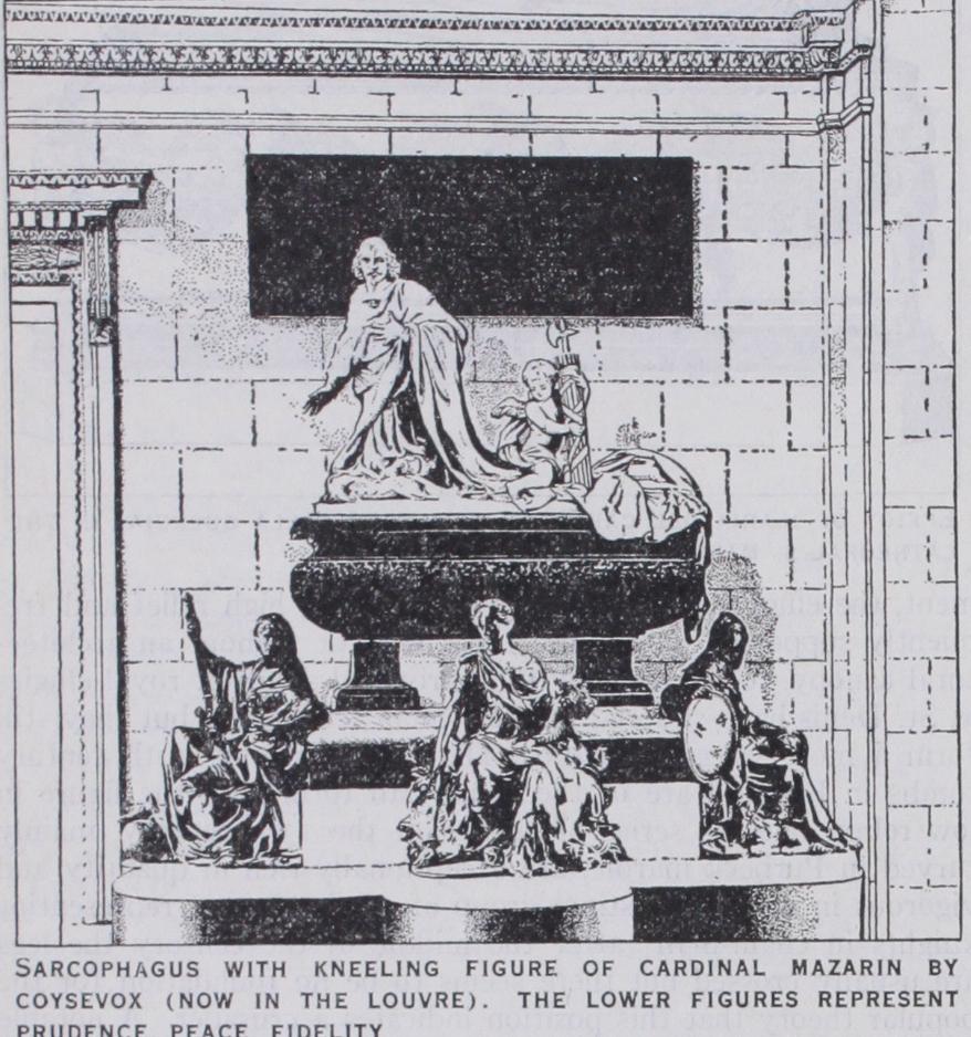 In the first half of the i6th century some very elaborate free standing and mural monuments were produced in France. The effigies are usually shown kneeling or reclining as in life. A typi cal example of the mural tomb with minutely characterized kneeling figures is the monument of the Cardinals d'Amboise at Rouen. One of the most magnificent of the huge free-standing monuments is that of Henry II. and Catherine de' Medici at St. Denis (1563-7o) by Germain Pilon. In England, the recumbent effigy is still the usual form on tombs of the transitional Gothic Renaissance period, the most characteristic type of monument being perhaps the large free-standing tomb chest without an archi tectural canopy.