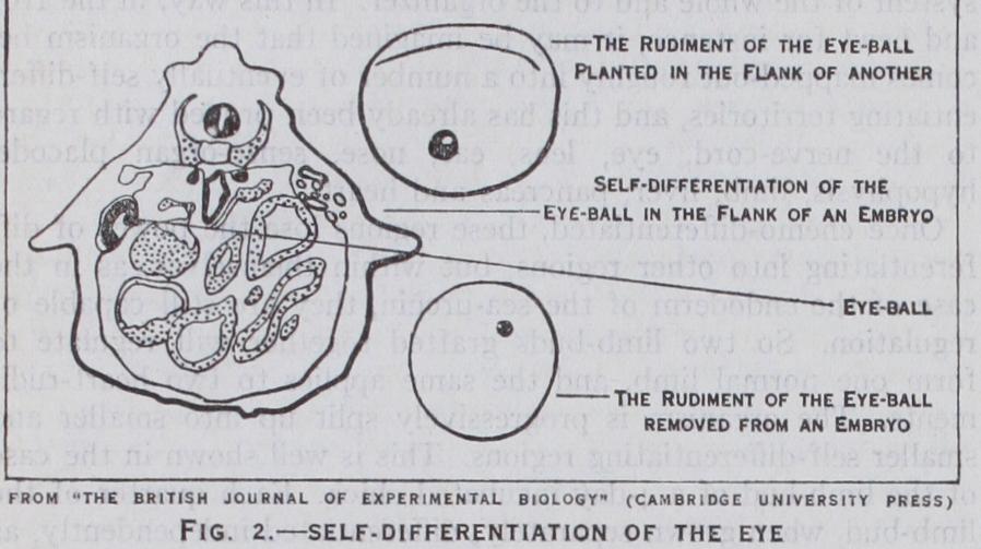 Lastly, it is known that the property of organizing is not inher ent in the cells of the organizer, but is something common to the region which they occupy. For if a piece of indifferent presump tive epidermis is grafted into the region of the organizer, and then cut out and grafted into a host, it will be found to function as an organizer. In other words, during its sojourn in the organizer region, it has been infected with the capacity to organize. The Eye and the Lens.—The eye-balls are, as already de scribed, pushed out from the brain and subsequently become con verted into the eye-cups. The lens fits into the rim of the cup, but it arises from a separate rudiment altogether, viz., the super ficial epidermis. How, then, does it come about that the lens dif ferentiates at the correct place so as to collaborate with the eye cup in the formation of the perfect eye ? This developmental cor relation is of the greatest interest and importance. In the first place it was found that in the grass-frog (Rana fusca), the lens did not differentiate if the eye-cup was removed, and that any epi dermis grafted over the eye-cup could be induced to differentiate into a lens, whether that was its presumptive fate or not. In other words, in R. fusca, the differentiation of the lens is dependent on that of the eye-cup which itself is dependent on the organizer. With regard to the lens, therefore, the eye-cup is a secondary or ganizer. The problem is however complicated by the fact that in the edible frog (Rana esculenta) the lens develops by self-differ entiation when the eye-cup is removed (at the tail-bud stage), and not all esculenta epidermis can be induced to differentiate into a lens when grafted over the eye-cup. At the same time, the eye-cup has the power to organize a lens from suitable tissue, as is shown by the fact that it can do so from the epidermis of toads. Rana esculenta, therefore, has a self-differentiating lens, and at the same time its eye-cup is capable of organizing one ; there is therefore what appears to be a "double assurance" that a lens will be formed. On the other hand, Rana fusca has a dependent-differen tiating lens. The apparent contrast between the two methods of lens-formation in such closely related species is, here again, only a matter of time. The self-differentiating capacity of the lens of Rana esculenta only means that at the stage operated upon, the presumptive lens-rudiment had already been sufficiently chemo differentiated to continue its development independently. At the operated stage, this condition had not yet been reached in the case of the lens-rudiment of Rana fusca. In almost all cases which have been sufficiently analysed, an organ which is self-differentiating at a particular stage is dependent-differentiating at an earlier stage. In the final analysis the chemo-differentiation of the various rudi ments is referable to their position with regard to the gradient system of the whole and to the organizer. In this way, in the frog and newt for instance, it may be imagined that the organism be comes mapped-out roughly into a number of eventually self -differ entiating territories, and this has already been proved with regard to the nerve-cord, eye, lens, ear, nose, sense-organ placode, hypophysis, limb, liver, pancreas and heart.