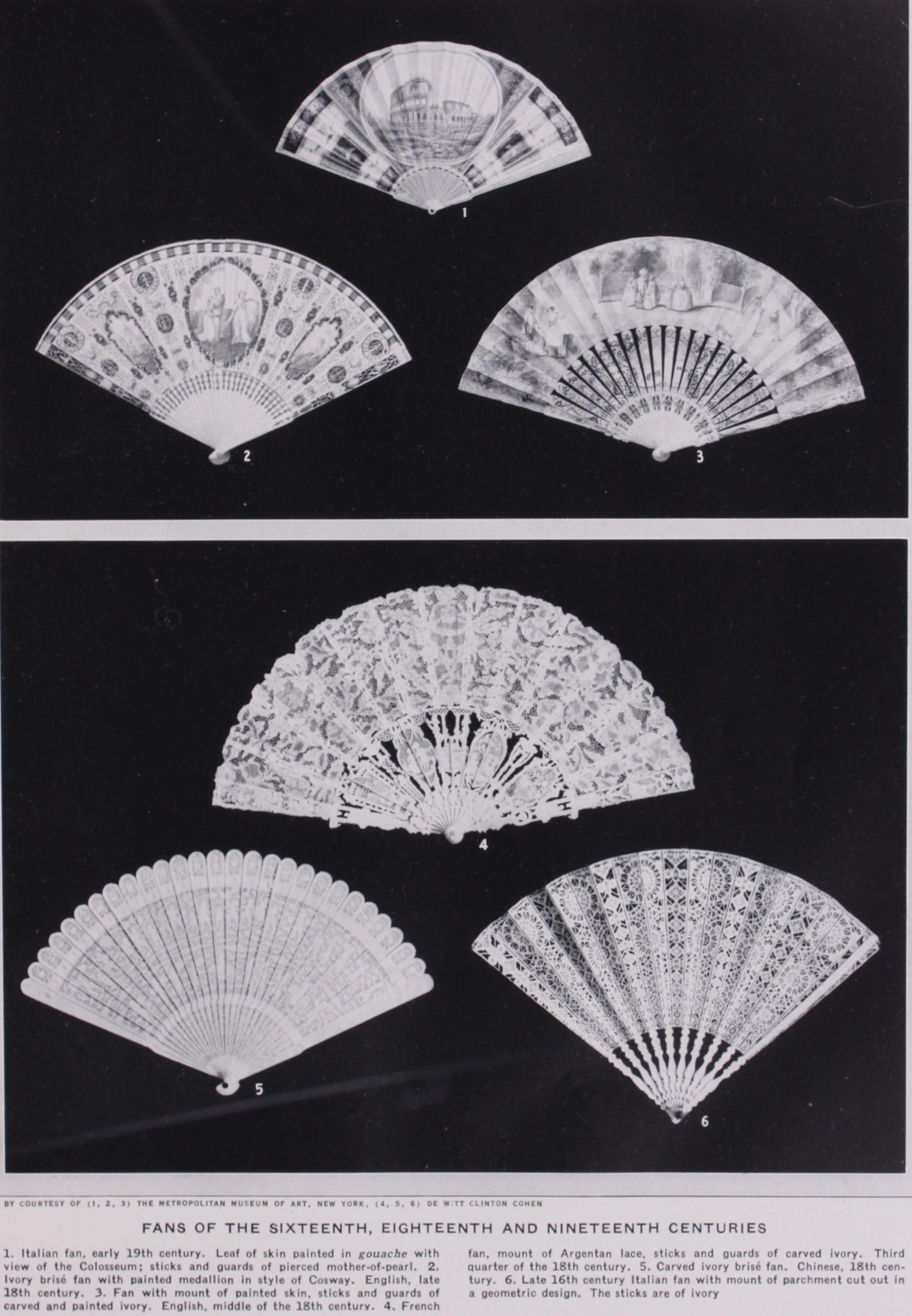 The vogue of the folding fan in Europe dates from its introduction through Portuguese trade connections with India and the Far East in the i6th century. Although it may have been known earlier, the impetus supplied by oriental impor tations produced a new era in its evolution. In popularity it soon supplanted the feather fan mounted on a carved ivory handle and the Venetian flag-like instrument. The type of folding fan found in late i6th century portraits is about a quarter circle in shape with sticks of ivory and a mount composed of alternate strips of vellum and mica, or of vellum cut out in a geometrical pattern of circles and lozenges similar to the designs of reticello lace of the period. Of this kind, called decoupe from the perforated vel lum mount, there is a beautiful example in the Cluny museum and one almost identical in a private collection in New York. It was at this time that the vogue for fans, already general in Italy and Spain, spread to France and England. Although not then confined to the use of ladies, special conventions were developed and gestures in handling them grew into code signals of amorous import.