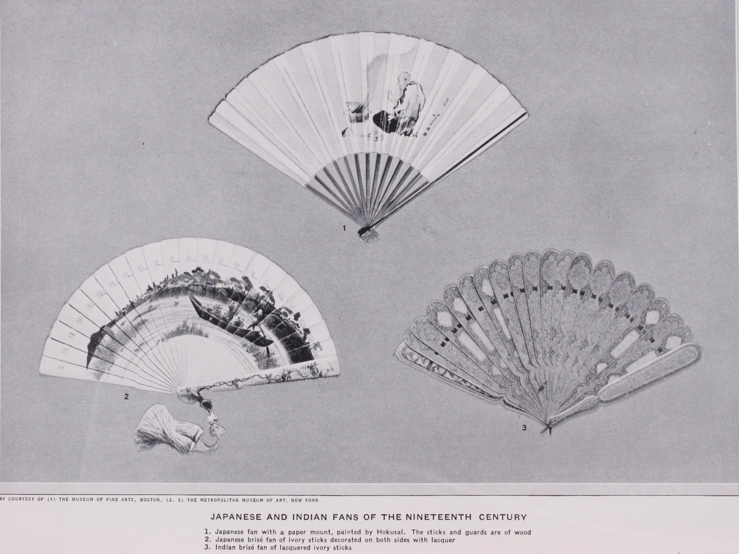 The fan of the Far East is the most ancient known to us and is a separate chapter in the history of the instrument. Some authorities testify that in China fans have been known since about 300o B.C. The earliest form was of dyed pheasant or pea cock feathers mounted on a handle. Cockade fans and large cere monial screens are also of ancient origin while the small hand screens of various shapes, made of palm, bamboo and silk stretched on a frame, have been in use from ancient to modern times. Ivory fans seem to have come into being shortly after the folding fan was introduced into China. The Imperial ivory works within the palace at Pekin were founded in the i 7th century and became the centre of the best productions. The delicacy of carv ing in ivory brise fans can hardly be overestimated. Sometimes the decoration is made up of pierced, flat, open work, sometimes of elaborately carved figure or floral subjects with a background formed by ribbing of exquisite quality. Tortoise-shell was used in a similar way, also sandalwood and mother-of-pearl. Filigree fans of silver or silver gilt frequently inlaid with enamel form another variation. A class of Chinese folding fan often seen is the man darin fan with sticks of carved ivory and the leaf painted with innumerable minute figures with ivory heads and silk costumes applied. Almost every city or district in China has its character istic fan distinguishable by its colour and ornament and made to suit every class from mandarin to peasant.