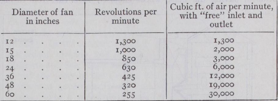 Protection against weather is frequently given by means of a hood, and against back draught when the fan is stopped by an automatic shutter; this has two light doors which close by gravity but fly open easily when the fan commences to run. The quantity of air moved in a given time depends on the speed, but the follow ing table affords an idea of output with Sturtevant fans : The blades in fig. 1 are of open sort, while another kind, the box blade, has the tips encircled by a binding ring, affording greater rigidity, and permitting of higher speeds. Very large propeller fans are built up to about 1 o ft. diameter, one of this size giving 246,000 cubic ft. at 25o revolutions per minute, and consuming 42 h.p. The small pressures produced by fans are measured against a column of water in a water-gauge, and stated in inches and parts of the inch.