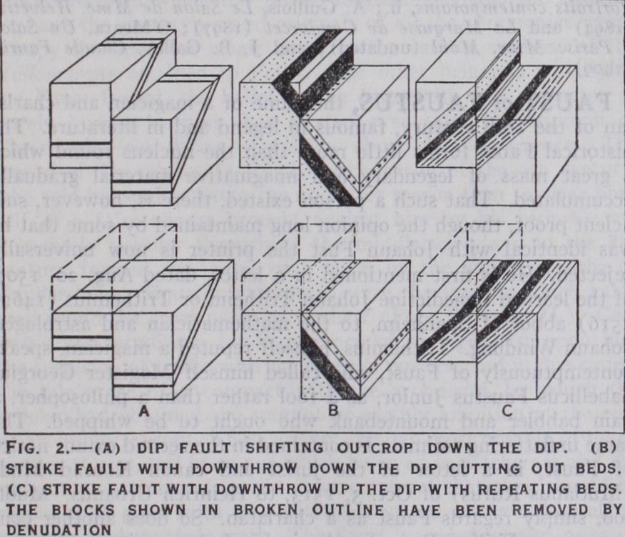 In geology, a fault is a dislocation in rocks, the result of crustal movements. Faults differ from joints in not being simply cracks, but fissures when differential movement of the two sides has taken place. The three principal types are known as normal faults, reversed faults or overthrusts and transcurrent faults. The surface of dislocation is called the fault-plane: not a plane in the mathe matical sense, since the surface is always found to be irregular and curved on being traced for any distance. The general inclination of this plane to the horizontal is the dip of the fault ; to the vertical the hade; where the fault is vertical there is no dip or hade. The amount of vertical displacement is the throw : of the lateral dis placement, the heave. In a gently inclined fault the heave will be great for even a small throw. The downthrow or downcast side of a fault is that side where the strata have moved relatively down wards: the other side is the upthrow or upcast. Faults, especially minor dislocations, run in any direction, but they are frequently found to coincide with the directions of dip and strike of stratified rocks and so to have a causal connection with systems of folding. Thus dip faults and strike faults arise. The effect of such faults on the outcrops of stratified rocks is shown in the diagrams.