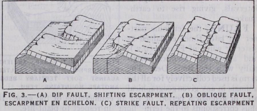 Origin of Faults.—Faults are connected with horizontal move ments and folding of the earth's crust. During the formation of mountains of elevation the crust is bulged upwards and the rocks are subjected to great compression. Relief is effected partly by folding and partly by overthrusting: if shear takes place before overfolding reversed faulting obtains. Transcurrent faults signify the differential movements forward of parts of thrusts. Normal faults form at the conclusion of the great movement when the mass begins to settle down. Direct subsidence in uncrushed regions also gives rise to normal faulting. In the great majority of cases faults have been as slow in their making as folds, for great river systems have been undisturbed by faults of thousands of feet throw, as in the course of the Colorado River. Fault scarps are nearly always due to the juxtaposition of rocks of widely differing resistance to weathering. Occa sional cases occur, however, where ancient faults have increased their throw by sudden jumps at intervals, giving rise to earth quakes.