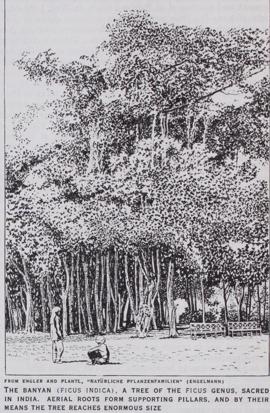 Ficus benghalensis, the banyan, wild in parts of northern India, but generally planted throughout the country, has a woody stem, branching to a height of 7o to loo ft. and of vast extent with heart-shaped entire leaves terminating in acute points. Every branch from the main body throws out its own roots, at first in small tender fibres, several yards from the ground; but these con tinually grow thicker until they reach the surface, when they strike in, increase to large trunks, and become parent trees, shooting out new branches from the top, which again in time suspend their roots, and these, swelling into trunks, produce other branches, the growth continuing as long as the earth contributes her sustenance. The tree usually grows from seeds dropped by birds on other trees. The leaf-axil of a palm forms a frequent receptacle for their growth, the palm becoming ultimately strangled by the growth of the fig, which by this time has developed numerous daughter stems which continue to expand and cover ultimately a large area. The famous tree in the Royal Botanic Gardens, Calcutta, began its growth at the end of the 18th century on a sacred date-palm. In 1907 it had nearly 250 aerial roots, the parent trunk was 42 ft. in girth, and its leafy crown had a circumference of 857 ft.; and it was still growing vigorously. Both this tree and F. religiosa cause destruction to buildings, especially in Bengal, from seeds dropped by birds germinating on the walls. The tree yields an inferior rubber, and a coarse rope is prepared from the bark and from the aerial roots.