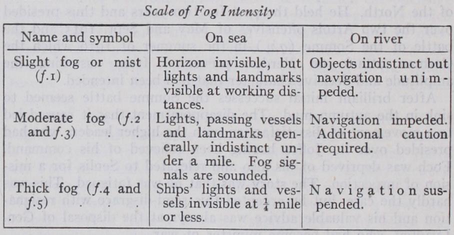 The Meteorological Office. the Admiralty and the Trinity House have adopted a scale of "fog" intensity for the use of observers in estimating and recording grades of obscurity caused by fog or mist.