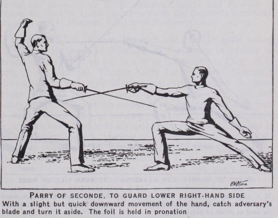 HOW TO FENCE Foil Fencing.—The target is limited to the bust, which is di vided by four imaginary lines varying according to the position of the hand. There are two prin cipal lines, one vertical and one horizontal, which cross each other at the place where the foil is held. For a right-handed fencer the inside-high line or left-high line is the space to left, of vertical line and above hori zontal line ; inside-low line or left-low line is the space at left of vertical and below horizontal line; outside-high line or right high line is space at right of ver tical line and above horizontal line; outside-low line or right low line is the space at right of vertical line and below horizontal line. For a left-handed fencer it is just the opposite. For each section there are two parries. The parries are direct or circular (counter). The direct parry wards off the opponent's thrust in the same line as the attack was made. The circular parry counter-wards off the opponent's Thrust in the opposite line the attack was made by means of a circular movement.