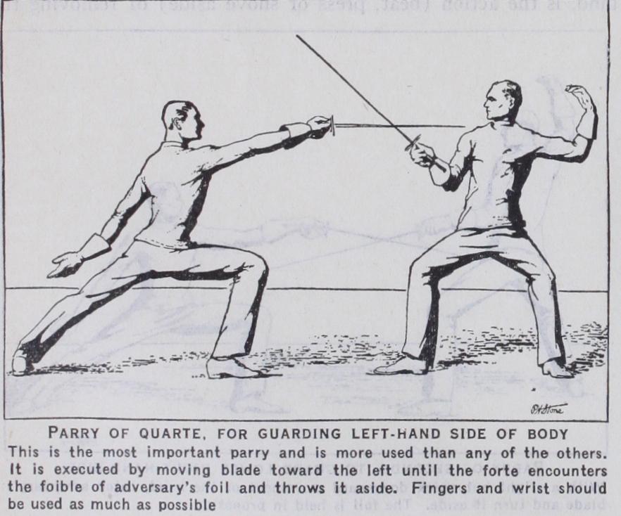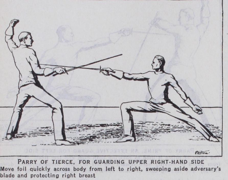 There are two parries for each line. In one the hand is held in supination, in the other in pronation. There are eight parries, each having its counter High-line right:— Tierce: Hand in pronation at height of chest towards right, foil pointed at opponent's eyes.