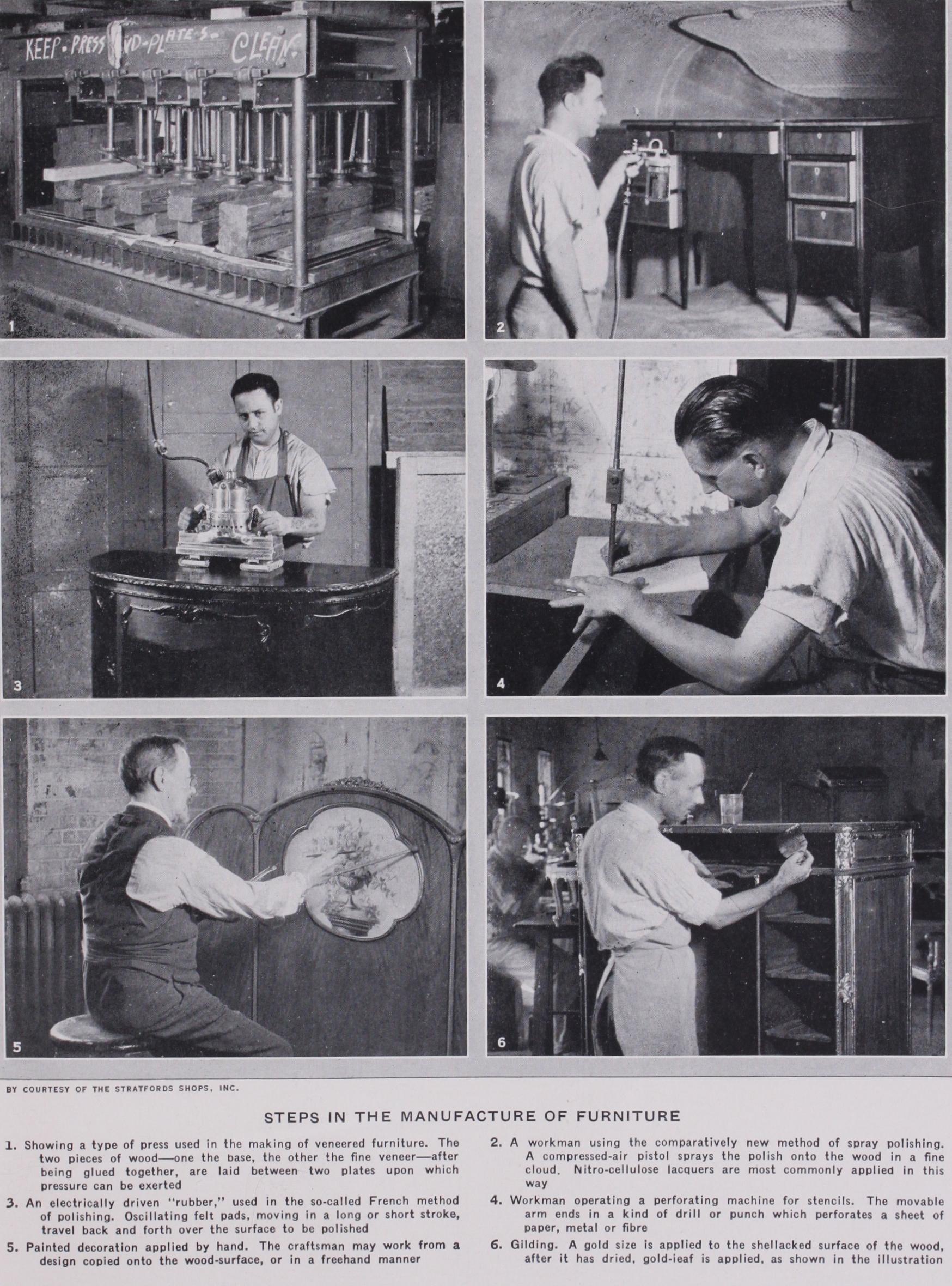 FURNITURE MANUFACTURE. Furniture manufac turing is one of the oldest industries. Up to the latter part of the 19th century, the trade was essentially a craft industry. Little of it still survives in that form, even in high-grade work, owing to the introduction of machinery, which is always used for doing the heavier operations of planing and sawing, from the log to the board. The extensive use of machinery has enabled furniture to be made at a price to place it within the reach of all classes.