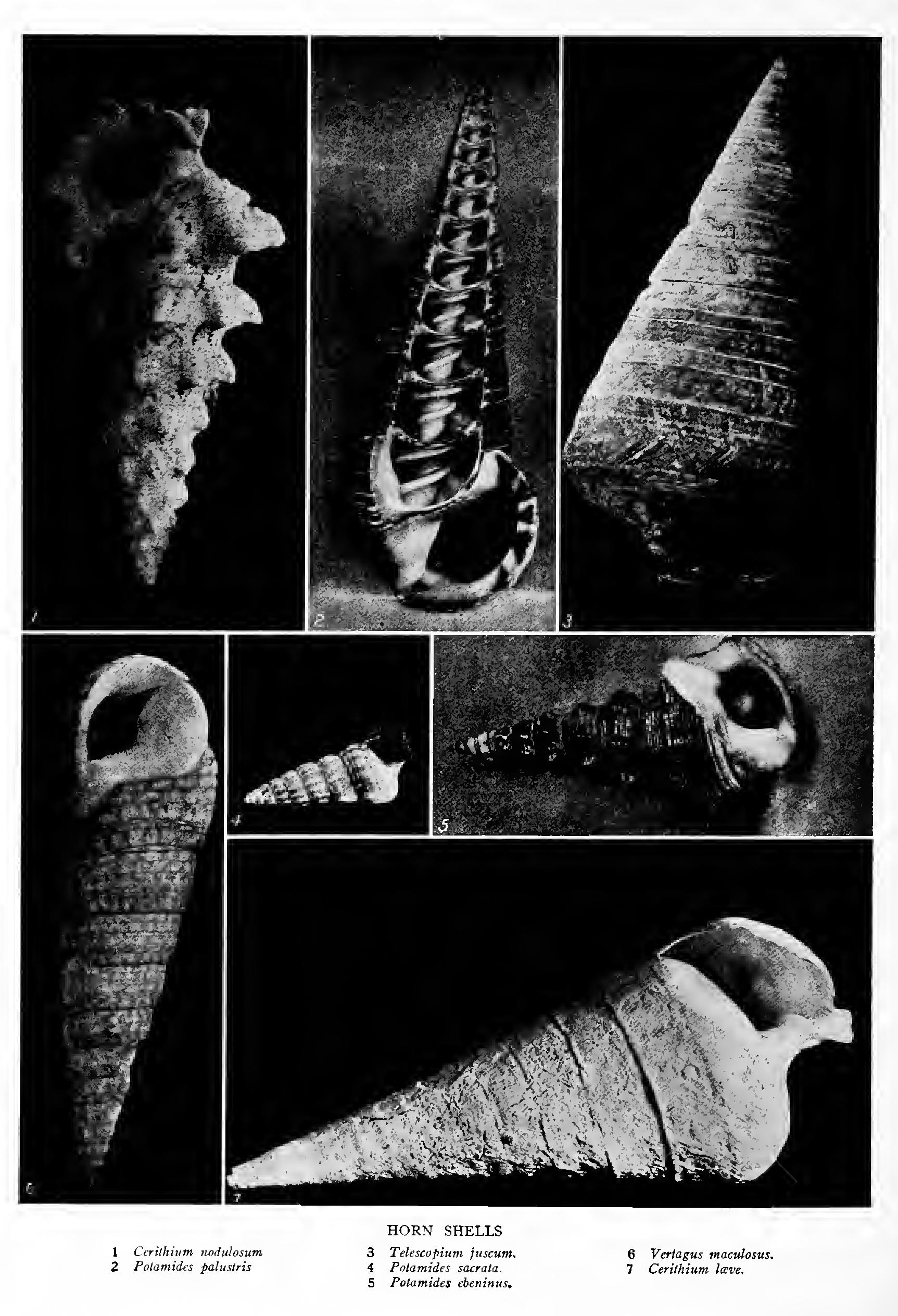 THE HORN SHELLS - FAMILY CERITHIIDAE. Shell spiral, much elongated, of many whorls, surface tuberculated; aperture channeled in front; operculum horny, spiral ; the head bears short muzzle, slender tentacles and stalked eyes. A large family of tropical and sub-tropical mollusks, living on rocks or among marine vegetation. A few forms live in brackish and fresh water. Some spend much time out of water, on stems of marsh plants.