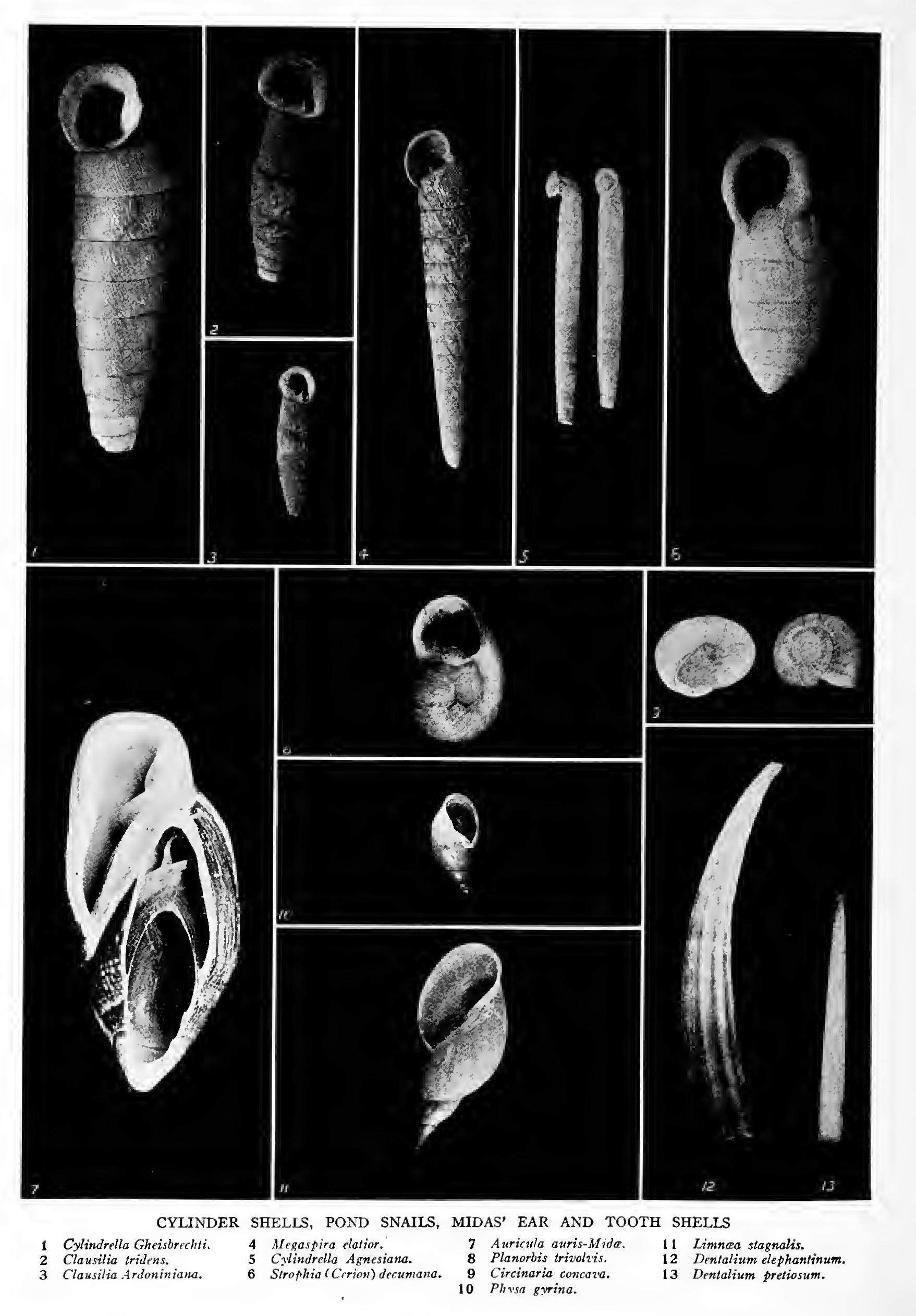 Shell smooth, whorls six or seven, banded and spotted with bright colours; columella short, callous, or toothed, often twisted; 276 The Agate Shells aperture small. A very large genus confined to the Hawaiian Islands. They live upon trees and bushes from the central water shed of each island down to sea level. Each isolated mountain valley has its own peculiar species. Among them are some of the most gaily painted shells known. A calamity fell upon the whole genus (and upon conchologists) when cattle were introduced into the Islands. The cropping of foliage by goats has destroyed vast tracts of undergrowth where the Achatine112 lived. Grazing herds of larger cattle are stripping the wooded regions. Many species have already disappeared.
