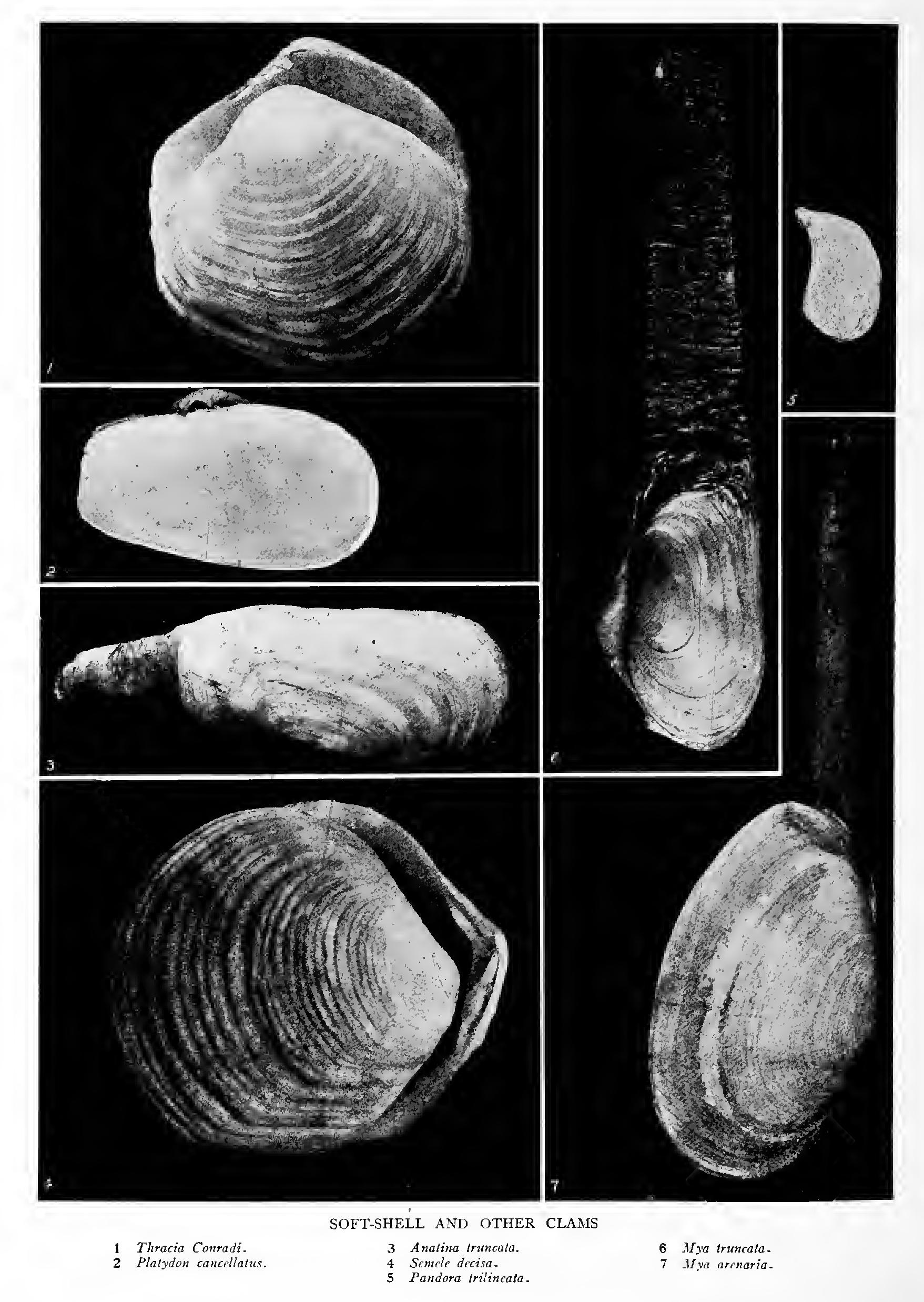 meris arcticus, Lam.) is found off New England coasts and dis tributed by way of Arctic seas to Norway and Asia. Its trape zoid shell is thick, and each valve is divided into equal triangular thirds by two raised ribs that diverge from the hinge. The squared posterior end is broad, but scarcely more so than the great siphon tube that emerges, wearing its tough, dark skin in wrinkles until it is stretched at full length. In New England a good average of these shells is three inches long. In Norway they grow somewhat larger.