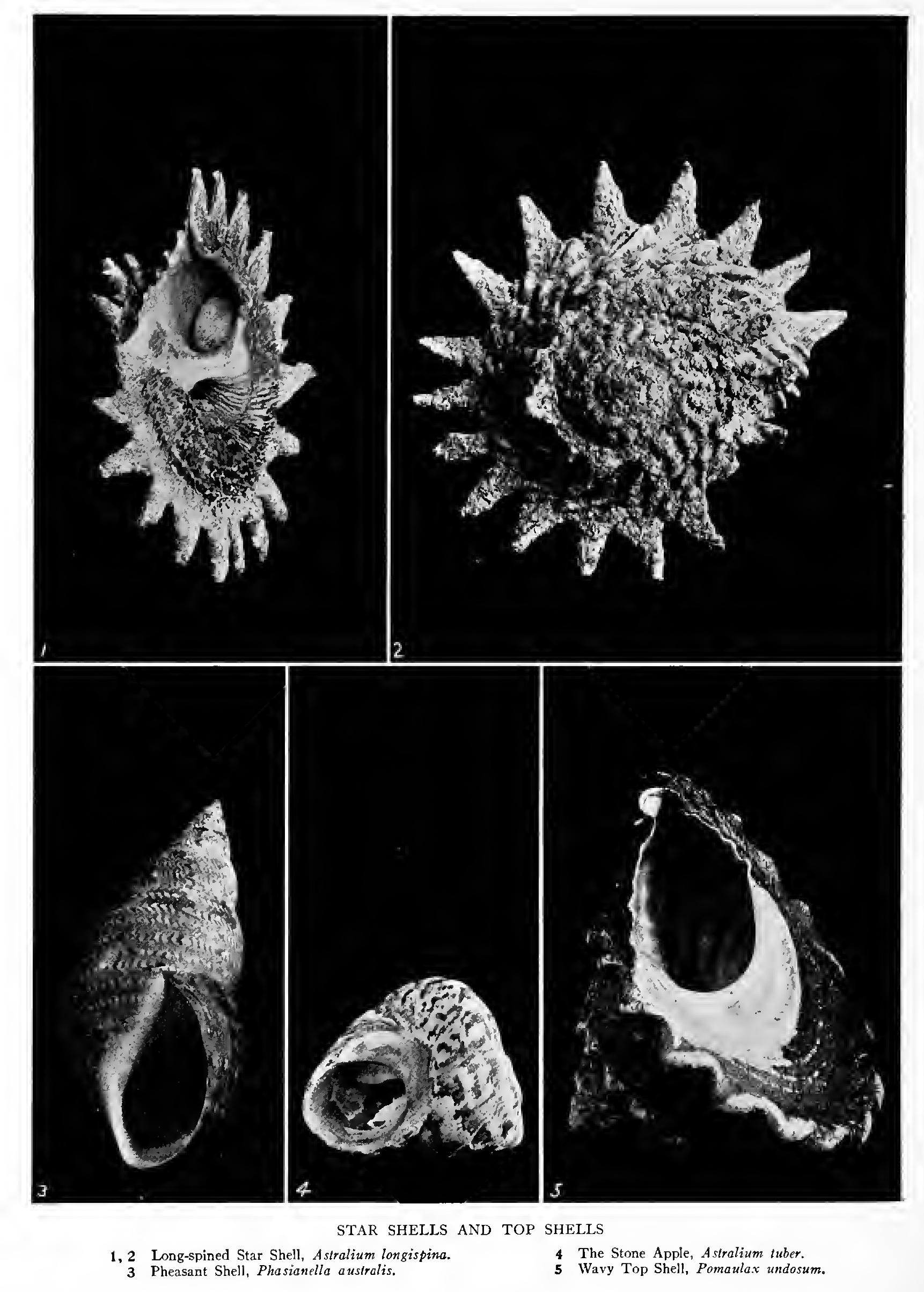 The Toothed Top Shell (T. dentatus, Forsk.) has a heavy tall spire, its coils (about twelve) armed with large remotely set knobs, which stand out perpendicular to the surface. The colour is pale, with faint and fine markings of red. There is a broad band of green or blue surrounding the axis. This species is about three inches high and two and a half inches in diameter.