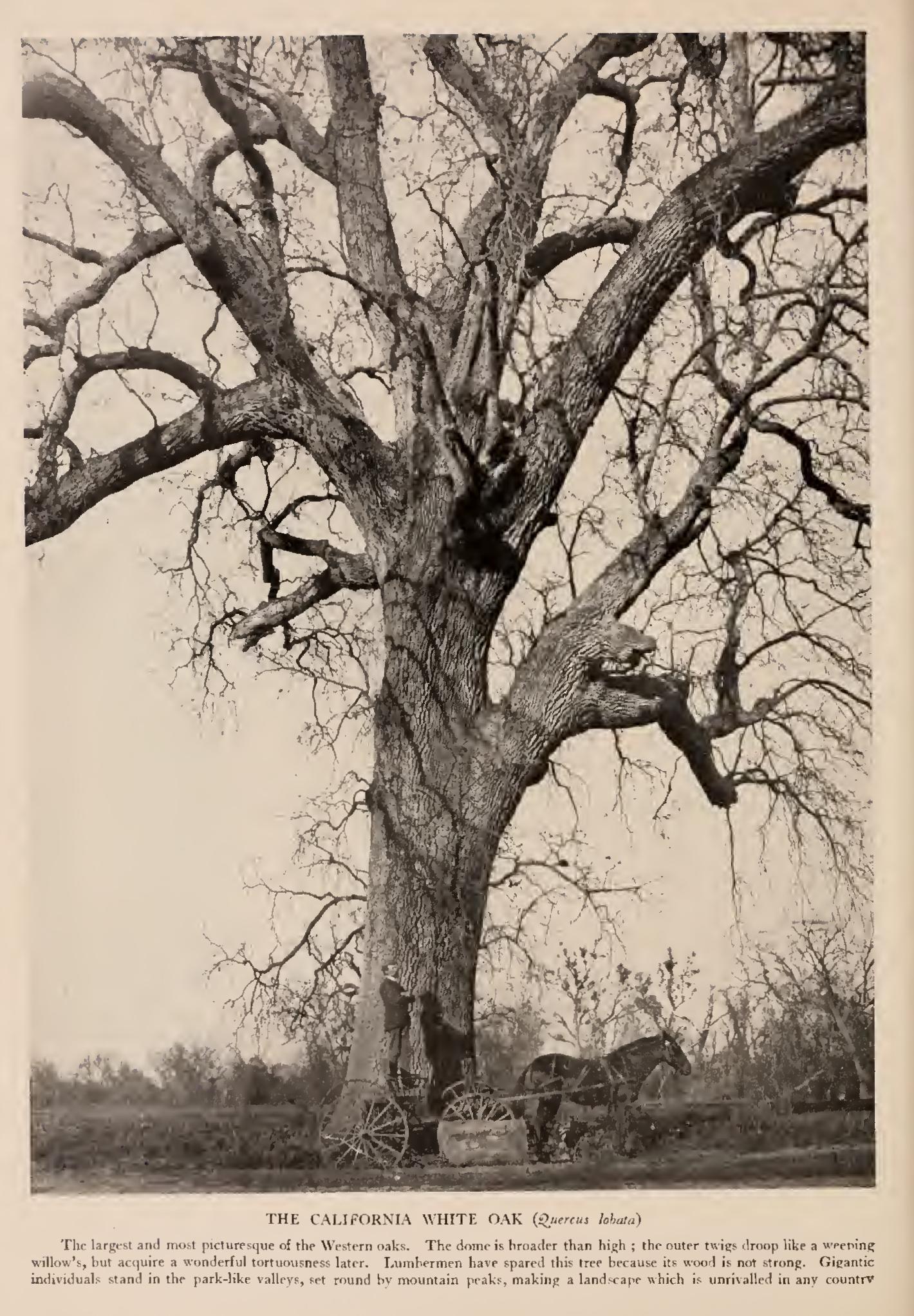 It is a happy circumstance for Californians and for all people who visit "the Land of the Setting Sun" that this valley oak is scorned by all lumbermen. The tree is practically worthless for timber, therefore gigantic individual trees stand scattered or grouped in the spacious valleys of western California, helping to make a landscape that cannot be duplicated this side of England. Indeed, Vancouver, journeying around the world in 1792, was astounded at the park-like Santa Clara Valley, set round with mountains, diversified with hills and intervales, covered with a carpet of verdure, and adorned with majestic oaks. Writing home of this landscape untouched by the hand of man, he says; "It required only to be adorned with the neat habitations of an industrious people to produce a scene not inferior to the most studied effect of taste in the disposal of grounds." The California white oak is the largest and most graceful of the Western oaks. Its branches end in long shoots that are pendulous like those of the weeping willow. The trunk branches near the ground and rises and spreads out like a great fan. A British elm often has the same habit—our American elm, some times. The dome is broader even than that of our Eastern white oak. The twigs are willowy at first, but there is a surprising tortuousness acquired with added years. The limbs are gnarled in the most complex way. "Picturesqueness gone mad" well characterises the expression of the tree in its bare winter aspect.
