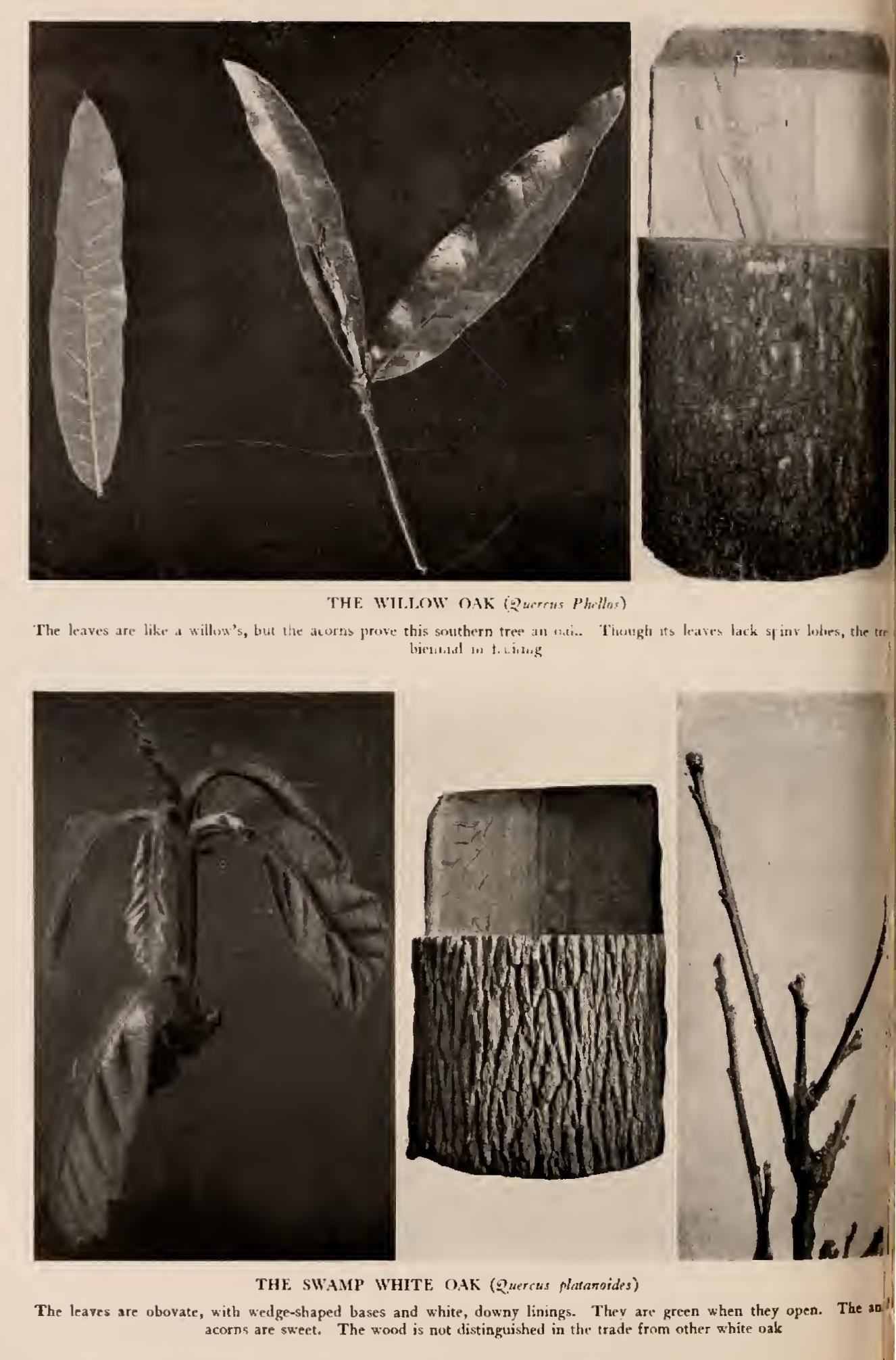 Swamp White Oak (Quercus platanoides, Sudw.)—A shaggy picturesque tree, 7o to TOO feet high, with pendulous branches, and crooked twigs forming a narrow, round head, bushy with dead twigs that hang on. Bark pale greyish brown, peeling in thin flakes from branches and trunk. Wood pale brown, coarse grained, heavy, tough, strong. Buds short, blunt, brown, hairy. clustered at tips of twigs. Leaves alternate, obovate, 5 to 7 inches long, wedge shaped at base, wavy toothed or lobed regu larly, dull, dark green above, white-downy beneath. Flowers staminate, hairy, yellow catkins; pistillate few on long peduncles, hairy with red stigmas. Acorns annual, paired, on long stems; nut oval, i to i inches long, brown, hairy at tip, in rough cup with thickened scales, sometimes fringed at border; kernel sweet, edible. Preferred habitat, moist or swampy soil. Distribution, southern Maine to southern Iowa; south to Maryland, Kentucky and Arkansas; along mountains into Georgia. Commonest about the Great Lakes. Uses: Picturesque tree in landscape, but rarely planted. Lumber not distinguished commercially from other white oak. Used in construction of houses, boats, agricultural implements and vehicles; also, for fencing, railroad ties and fuel.