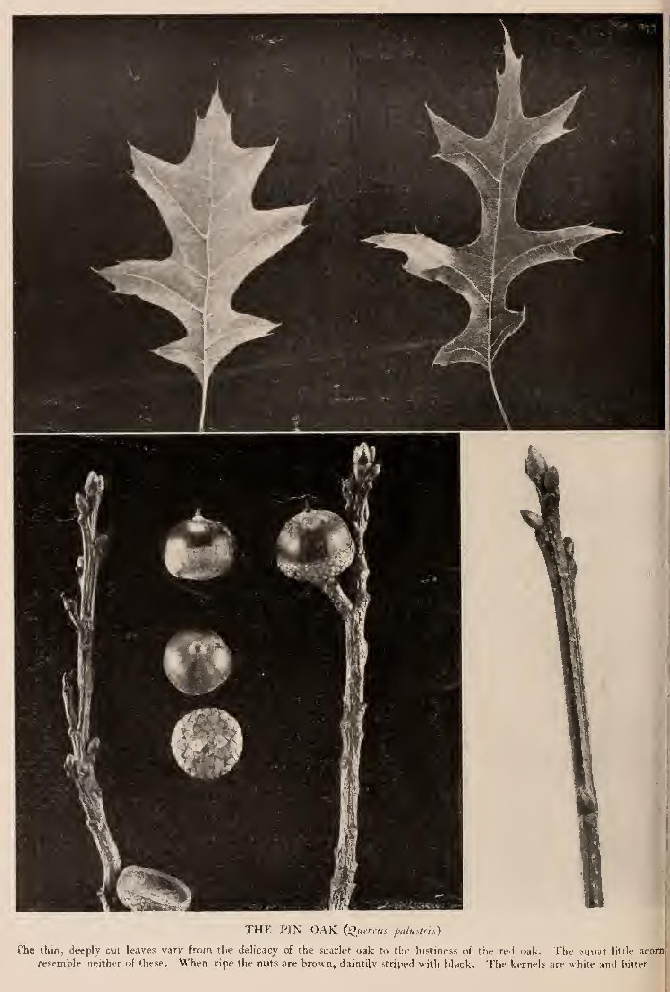 Pin Oak, Swamp Spanish Oak (Quercus palustris, Linn.) —A graceful, pyramidal tree when young, becoming oblong and irregular, at length; 5o to 12o feet high; branches horizontal, short. Bark grey-brown, shining, smooth, becoming scaly on trunk; twigs red, tomentose. Wood hard, tough, strong, heavy, coarse grained, light brown, variegated. Buds small, acute, brown. Leaves alternate, 4 to 6 inches long, deeply 5 to 7-lobed with wide sinuses almost to the midrib, shining above, dull and pale beneath, scarlet in autumn. Flowers in May, with half grown leaves; staminate, in hairy catkins, 2 to 3 inches long; pis tillate on short hairy peduncles, with bright red stigmas. Acorns