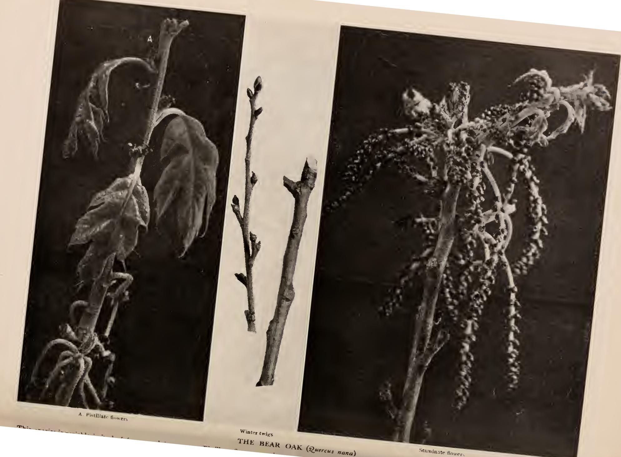 The Bear, or Scrub Oak (Q. nana, Sarg.), is a shrubby tree that creeps in thickets over rocky barren ledges from Maine to Virginia and Kentucky. Its downy-lined leaves vary greatly in their size and lobing. They are obovate, with the three largest lobes at apex, and tapering to the base, with at least one pair of lesser lobes below the broad middle sinuses. There is a resem blance between these and the leaves of the post oak, although the sharp, holly-like spines that tip each lobe and the two sizes of acorns each tree shows in summer prove this species to belong in the black-oak class. The little acorns, which are bitter and set in shallow saucers, are abundantly produced, and bears fatten on them. The species is often effectively planted to adorn rocky areas in parks.