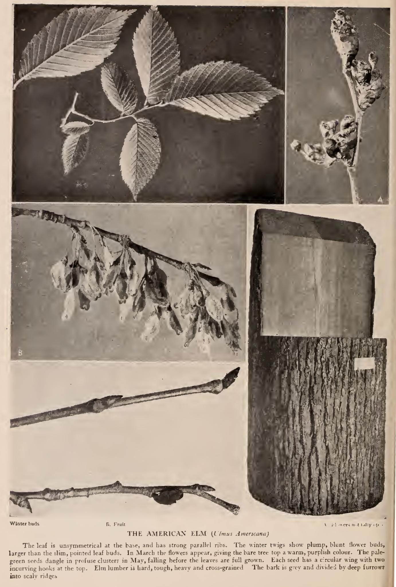 Classical literature proves the antiquity and the great im portance of the elms of southern Europe. The Romans used elm leaves as forage for cattle, In the vineyards elms were planted to support the vines. The trees were well pruned so they'should not overshadow the grapes. It was counted danger ous to give bees freedom to visit blooming elms, lest they become surfeited, and sicken as a result. In this opinion the early observers were evidently mistaken. Virgil discourses upon the successful grafting of oak upon elm, and describes swine eating acorns that dropped from the fruiting branches of this wonderful tree. Experiment long ago proved the fallacy of this report. In England the rustic still watches the elm for signal to sow his grain, relying on the old saw: "When the elme leaf is as big as a mouse's ear, Then to sow barley never fear." The witch hazel (Harnamelis Virginiana) does not grow in England, but the wych elm was known in some regions by this name, because its leaf is hazel-like. Long bows were anciently made of its wood, and it was mentioned in the "Statutes of England." Slippery Elm, Red Elm (U. fulva, Michx.)—Fast-growing tree, 6o to 70 feet high, with erect, spreading branches, forming a broad, open head. Twigs stout, rusty, downy. Bark brown ish, rough, scaly. Wood strong, hard, heavy, coarse, reddish brown, durable in soil. Buds densely rusty, pubescent; large, blunt. Leaves alternate, deciduous, 2-ranked, broadly oval, 4 to 7 inches long, irregularly heart shaped at base, acuminate at apex, doubly serrate, strongly ribbed; on short, stout petiole; surface rough both ways, stiff, harsh. Flowers, April, before leaves, fascicled, numerous, Fruits, May, rounded, hairy, only on seed, wing not ciliate, margined. Preferred habitat, fertile soil along streams. Distribution, lower St. Lawrence River, through Ontario to Dakota and Nebraska; south to Florida; west to Texas. Uses: Wood used as fence posts and railroad ties; for wheel hubs, sills and agricultural implements. Mucila ginous inner bark used to allay fever and inflammation.