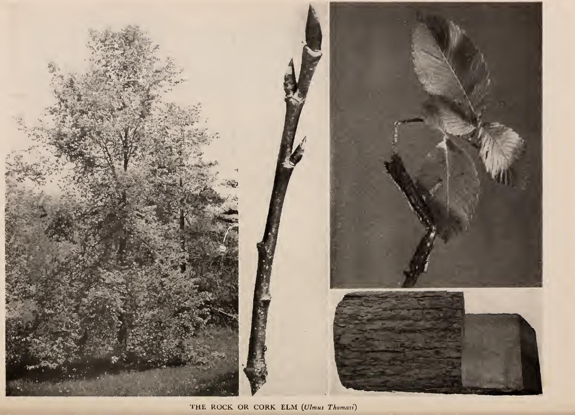 The Rock or Cork Elm (Ulmus Thomasi, Sarg.) has shaggy stout limbs like a bur oak's, and a rugged, stiff expression quite unusual in an elm. A look at the foliage is reassuring, for elm leaves vary but slightly in the different species. In spring the type of inflorescence is the best botanical character to depend upon.