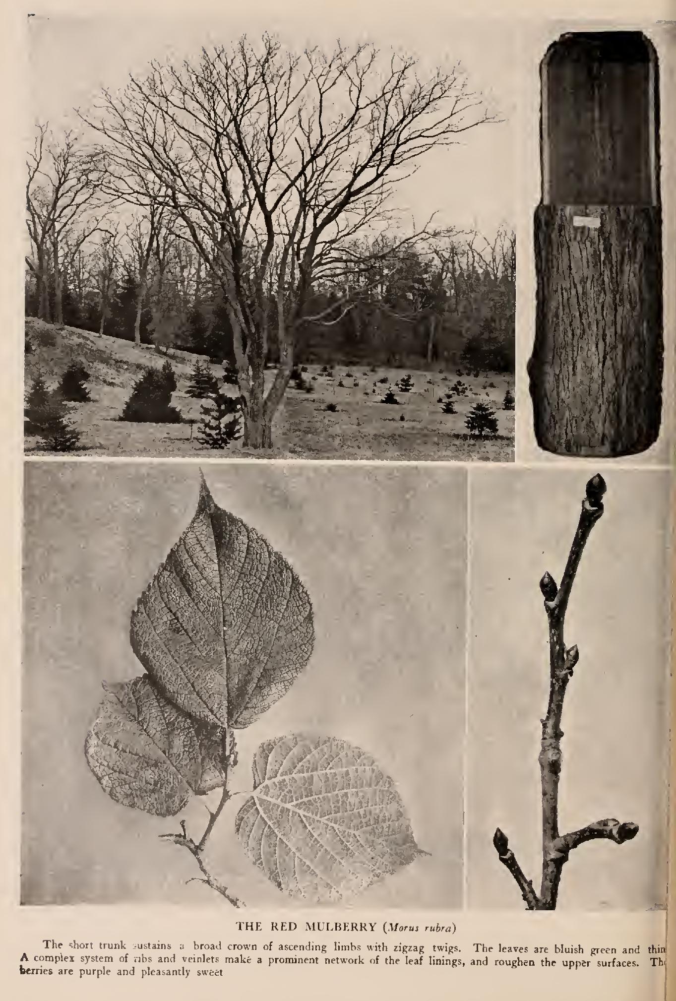 Hackberry, Nettle Tree, Sugar Berry (Celtis occidentalis, Linn.)—Tree, 5o to 125 feet, with slender trunk and round head, of very slender, bushy twigs and pendulous branches. Bark light brown or pale grey, broken into thick warts or scales by deep rows; branches often corrugated and warty. Wood light yellow, heavy, soft, coarse, weak. Buds axillary, never terminal; acute, ovate, small. Leaves simple, alternate, ovate, 21 to 4 inches long, often fulcate, oblique at base, serrate above widest part, entire below it; thin, deep green, with downy lining; 3-nerved, from slim petiole; autumn colour yellow. Flowers, May, moncecious, or mixed, greenish, axillary staminate, clustered at base of sea son's shoot; pistillate solitary, in axils of leaves, green, with spreading, 2-horned stigma. Fruits, September, oblong, thin, fleshed berry, to inch long, purple, sweet; hangs all winter. Preferred habitat, moist soil along streams or marshes. Distribu tion, Southern Canada west to Puget Sound; south to Florida, Tennessee, Missouri, Texas and New Mexico. Uses: Planted for shade and ornament. Wood used for cheap furniture and fencing.