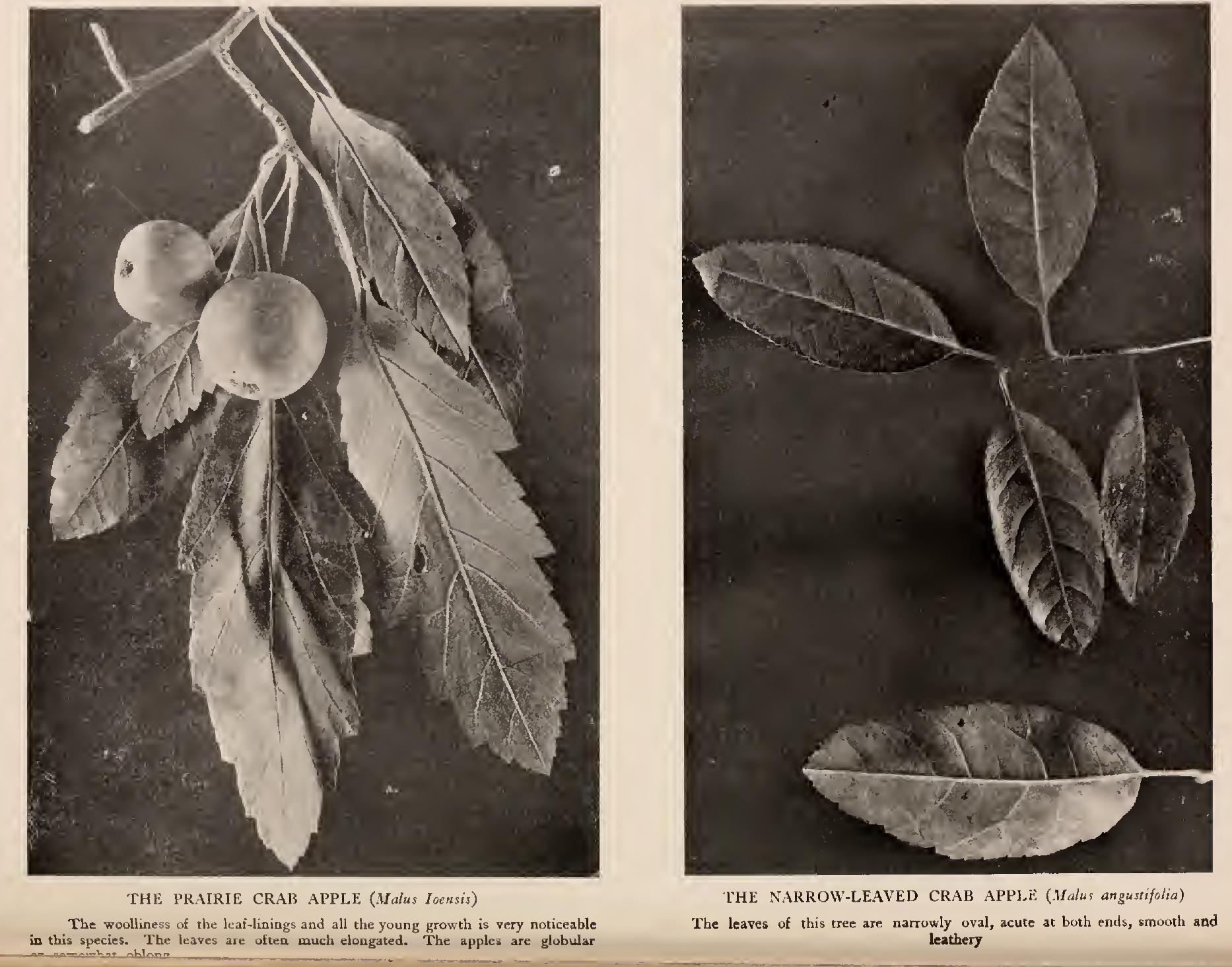 The Prairie Crab Apple (Malus loensis, Britt.) is the species found from Wisconsin to Oklahoma. It has only recently been distinguished from M. coronaria, which its flowers closely resemble. Its leaves are shorter and oval in shape, with deep, irregular teeth, and linings of silky white down. The dull green apples are of good size, larger than the other native crabs, and are not at all flattened. It is the woolliness of all the young growth in summer that will chiefly distinguish this tree.