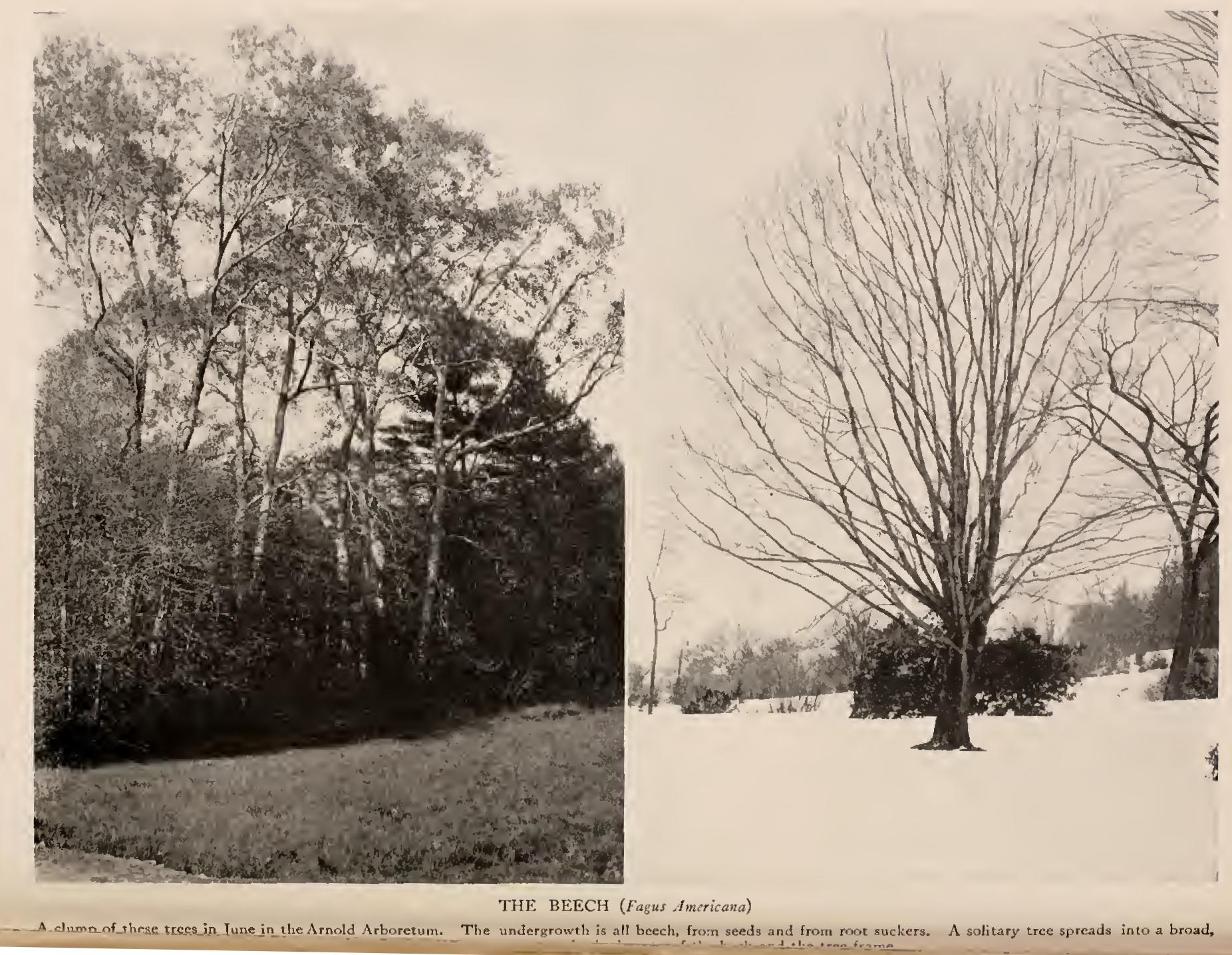 Beech (Fagus/1 nwricana, Sweet.)—A round-topped or conical tree, with horizontal or drooping branches, and dense foliage; 5o to 75 feet high. Bark close, smooth, pale grey, or darker, often blotched; branches grey, twigs brown, shining. Wood light red, close grained, hard, strong, not durable, tough; lustrous when polished. Buds alternate, tapering, to 1 inch long, brown, in silky scales. Leaves oblong-ovate, strongly feather veined, saw toothed, pointed, smooth, silky or leathery, green on both sides; autumn colour, pale yellow, persistent till late. Flowers moncecious, May, staminate in pendant balls, few at base of leafy shoot, yellow-green; pistillate, solitary or paired, in axils of upper leaves, short-stemmed, in scaly involucre. Fruit, October, a prickly bur containing 2 triangular, pale-brown nuts, sweet, edible, in thin shells. Preferred habitat, rich river bottoms. Dis tribution, Nova Scotia to Lake Huron, and northern Wisconsin; south to Florida, Missouri and Texas. Uses: Beautiful orna