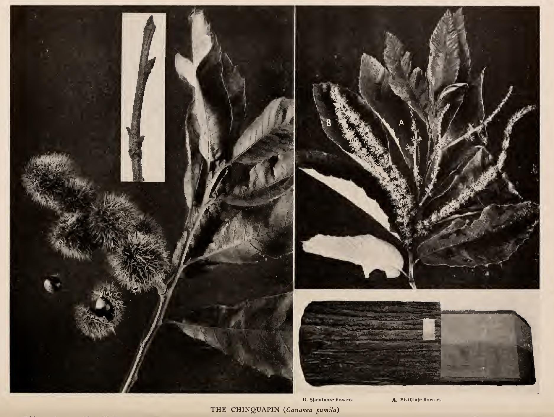 The Chinquapin (C. pumila, Mill.) is the chestnut in minia ture—rarely a tree of medium height and spreading habit—usually a shrub that seizes the land by its suckering roots, and forms thick ets on hillsides and bare ridges or on the margins of swamps. It