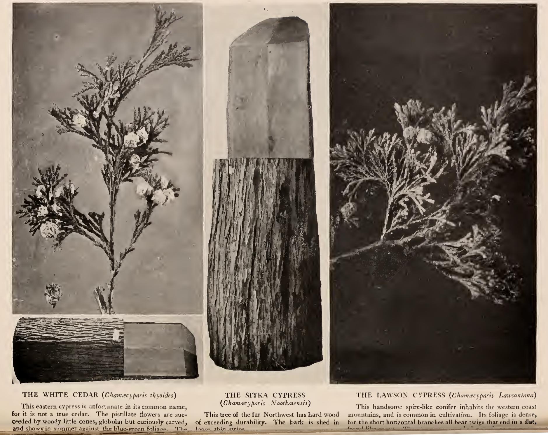 White Cedar (Chameecyparis thyoides, Britt.)—A fast growing, pyramidal tree, 4o to 8o feet high, with flat, graceful spray on erect, spreading branches. Bark pale, reddish brown, furrowed, stringy, often terminal. Wood light reddish brown, soft, light, weak, aromatic, close grained, easily worked, very durable in soil. Buds naked, very small. Leaves dull blue-green, minute, scale like, opposite, 4-ranked, lateral pairs keeled, others concave, fitting compressed twigs. Flowers, April, moncecious, small, terminal, made of 4 to 6 scales; staminate red or yellow, abundant; pistil late few, greenish. Fruit woody, spherical cone, I- inch in diame ter, annual, glaucous, blue-green, becoming brown; scales with beak in centre; seeds winged, 1 to 2 under each scale. Preferred habitat, deep swamps near seacoast. Distribution, seaboard states, Maine to Mississippi. Uses: Important ornamental evergreen. Wood used for interior finish of houses, for boats, fence posts, rail road ties, buckets, barrels, shingles, and small woodenware.