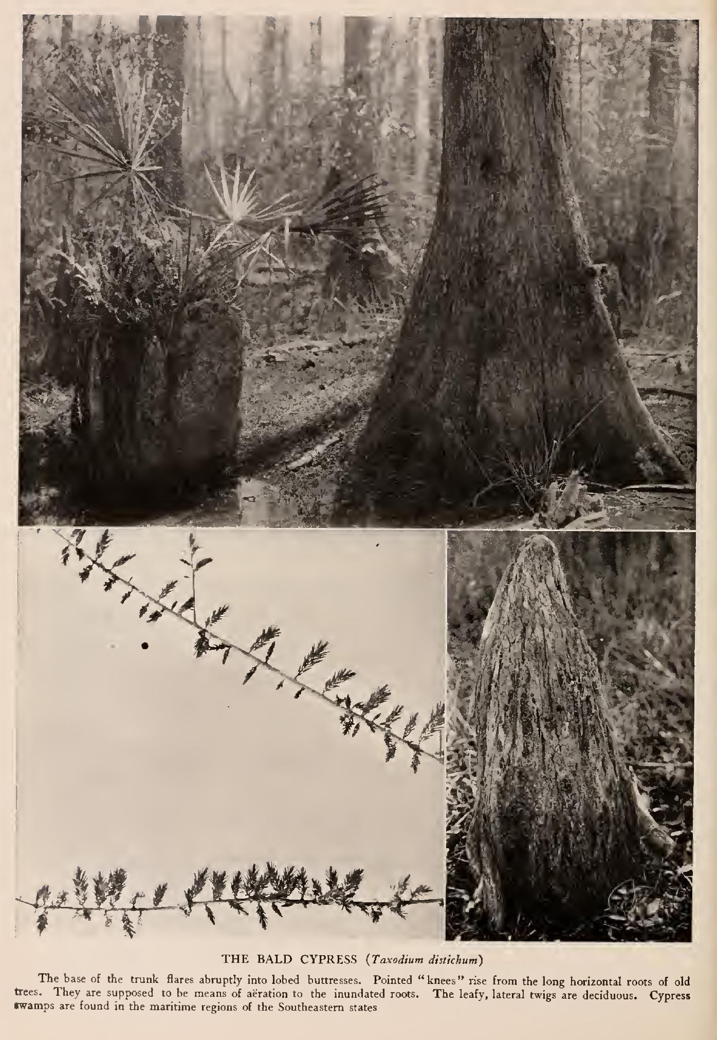 Bald Cypress (Taxodium distichum, Rich.)—A tall pyra midal tree, 75 to 15o feet high, with pendulous branches, becoming broad and round headed when old. Trunk lcbed above, strongly buttressed and usually hollow at the base. Roots long, horizontal, with vertical anchor roots. Bark pale reddish grey, scaly, divided by shallow fissures. Wood soft, light, brown, easily worked, durable. Buds minute, globular, scaly, silvery. Leaves decid uous with the branchlets linear, to inch long, 2-ranked, spreading or scale-like, closely appressed. Flowers: moncecious, small; staminate in loose, drooping panicles, 4 to 6 inches long; pistillate globose, scaly, scattered near ends of twigs. Fruit annual, globular, woody cones, in pairs or solitary, I inch in diameter; seeds winged, 2 under each scale. Preferred habitat, swamps of coast or river bottoms. Distribution, Delaware to Florida; west into Texas; north along Mississippi to Missouri, Indiana and Illinois. Uses: Lumber for buildings, doors, shingles, cooperage, fencing and railroad ties. Planted as an ornamental tree in Northern States and in Europe.