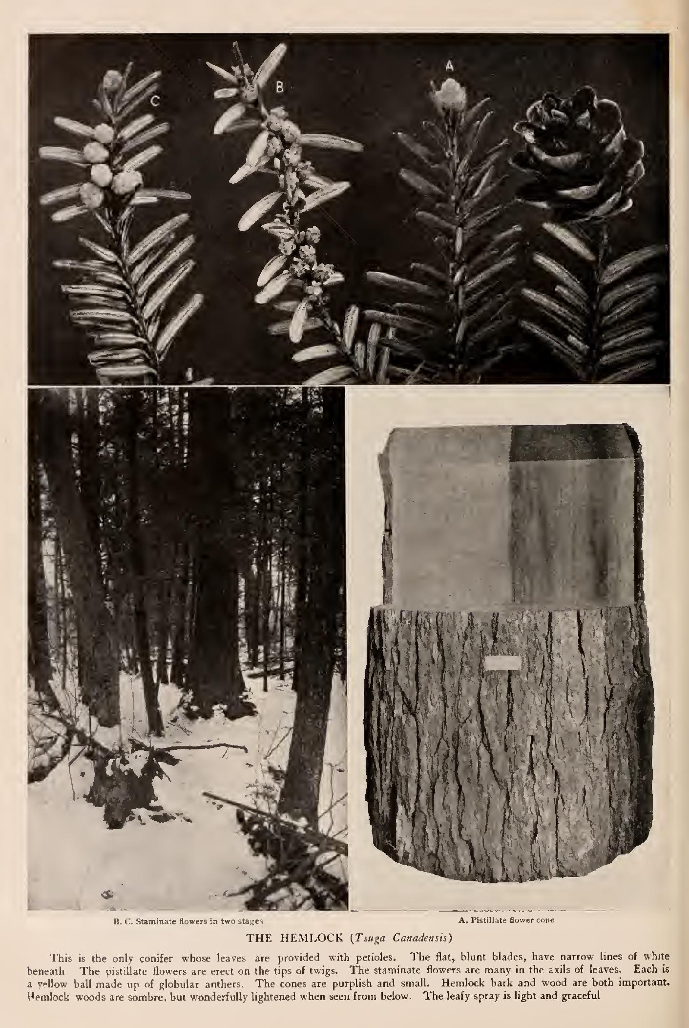 Hemlock (Tsuga Canadensis, Carr.)—A broadly pyramidal tree, 6o to loo feet high, with tapering leading shoot and pen dulous horizontal limbs. Bark cinnamon red to grey, thin, fur rowed, scaly. Wood light, soft, coarse, cross-grained, not durable. Buds small, obtuse. Leaves flat, blunt, pale beneath, dark, shining above, on short petioles jointed to projecting bases, 2-ranked, shed in third year. Flowers in May, moncecious, soli tary; pistillate terminal on short shoots. Fruit small, annual cones, falling in spring, oval, thin scaled, red-brown, turning to grey. Preferred habitat, rocky uplands near streams. Dis tribution, Nova Scotia to southern Michigan, central Wisconsin and Minnesota; southwa Delaware, and along Appalachian Mountains to Alabama. Wood, in building and for rail road ties; bark, in dyeing and in tanning leather. Cultivated as an ornamental tree and hedge plant.