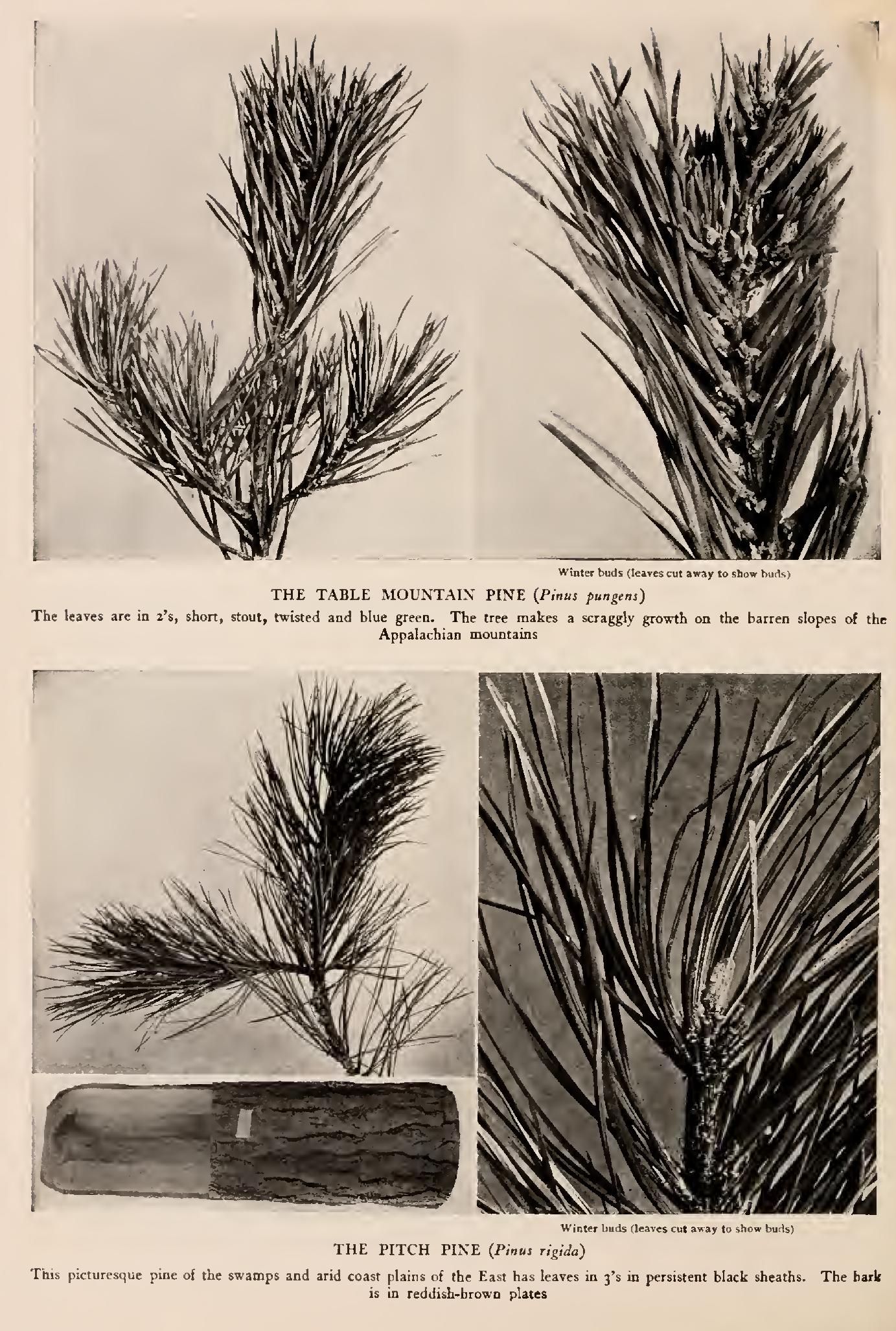 Pitch Pine (P. rigida, Mill.)—A gnarled, irregular tree 5o to 75 feet high, with short trunk and rigid, rough branches. Bark thick, broken into plates by deep, irregular fissures; scales thin; bark red or purple. Wood light red, soft, durable, brittle, coarse. Buds to inch long, reddish, with fringed scales.