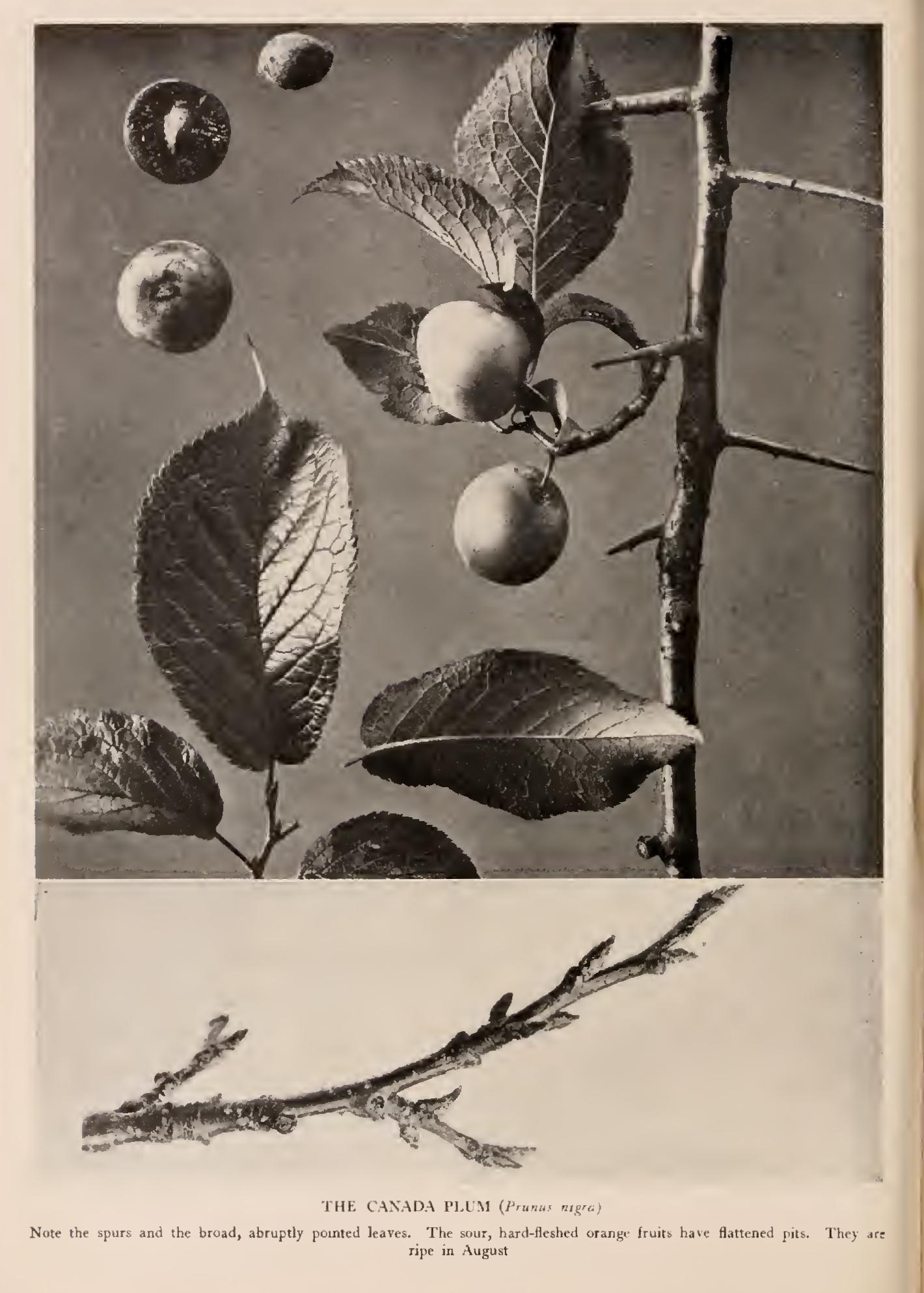 THE PLUMS Wild Red, or Yellow Plum (Prunus Americana, Marsh.)— A graceful little tree, 15 to 20 feet high, with thorny limbs. Bark thick, grey. Leaves oval, taper pointed, sharply toothed. Flowers in April, before the leaves, in lateral umbels. Fruit globose, red or yellow, with pleasant taste, but covered with leathery, acid and puckery skin. Pit, with two sharp edges. Preferred habitat, moist woods and river banks. Distribution, New York to Texas and Colorado. Uses: Good stocks on which to graft less hardy varieties. Deserves planting as an ornamental, and cultivation to improve its fruit.