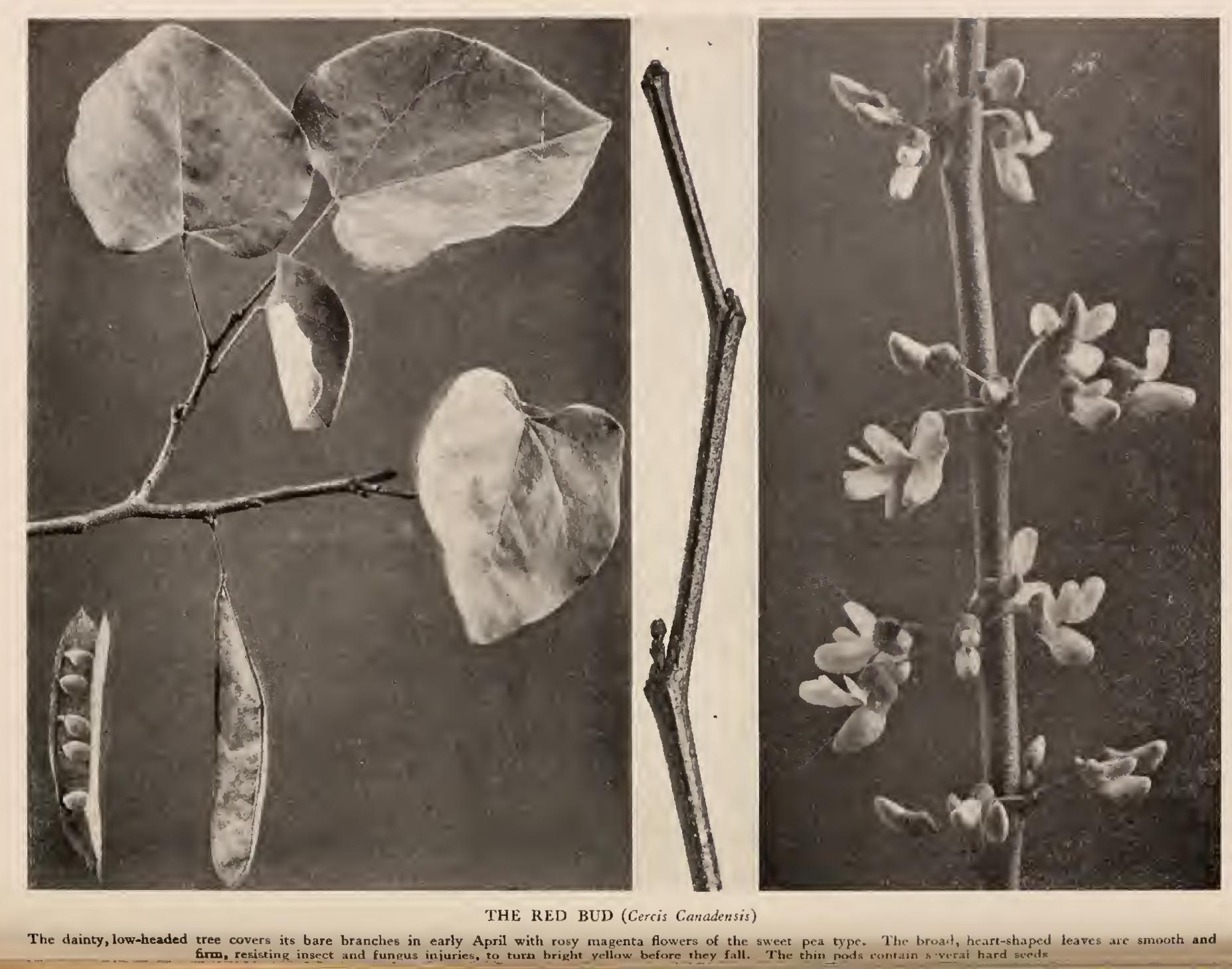 Red Bud, Judas Tree (Cercis Canadensis, Linn.)—A dainty tree, sometimes 40 to 5o feet high, oftener much smaller, with broad, flat head of slender, smooth, thornless, angular branchlets. Bark reddish brown, furrowed deeply and closely, broken into small, scaly plates; twigs brown or grey. Wood heavy, hard, close grained, weak, red-brown. Buds inconspicuous, axillary, scaly, blunt. Leaves simple, entire, broadly heart shaped or ovate, alternate, deciduous, on long, slender, smooth petioles which are enlarged at apex; autumn colour yellow. Flowers, April, before the leaves, in axillary fascicles, pea-like, 1 inch long, rose pink to purplish; numerous, conspicuous. Fruit a pod, thin, pointed, flat, smooth, lustrous, purplish, stalked, 2 to 3 inches long. many-seeded. Preferred habitat, borders of streams, under other trees. Distribution, New Jersey to western Florida, Alabama, Mississippi, Texas; Ontario to Nebraska and south. Maximum size, Arkansas to Texas. Uses: Important hardy ornamental tree. Grown in Europe. Flowers sometimes eaten as a salad.