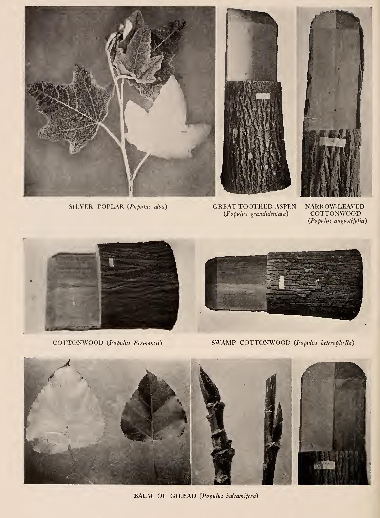 Cottonwood (Populus deltoidea, Marsh.)—Much-branched tree, 6o to 15o feet in height; diameter 5 to 7 feet. Bark deeply furrowed, grey-brown, becoming greenish; often ashen grey on old trees. Wood dark brown; sap wood white; weak, compact, light. Buds large, pointed, resinous. Leaves broadly ovate, taper pointed, 3 to 5 inches long, margin wavy and coarsely toothed, thick, shining, paler beneath, yellow in fall; petiole long, slender, flat, red or yellow. Flowers, March, in pendant catkins, 3 to 5 inches long, loosely flowered; staminate red, numerous; pistillate green, sparse on trees. Fruits, May, aments 6 to 12 inches long; capsules ovate, often curved, 2-valved; seeds in white, cottony mass. Preferred habitat, moist soil along streams. Distribution, Quebec to Northwest Territory; south to Florida; west to Colorado and New Mexico. Uses: Much planted for shade and windbreaks in the prairie states. Wood has recently come into use in making packing cases.