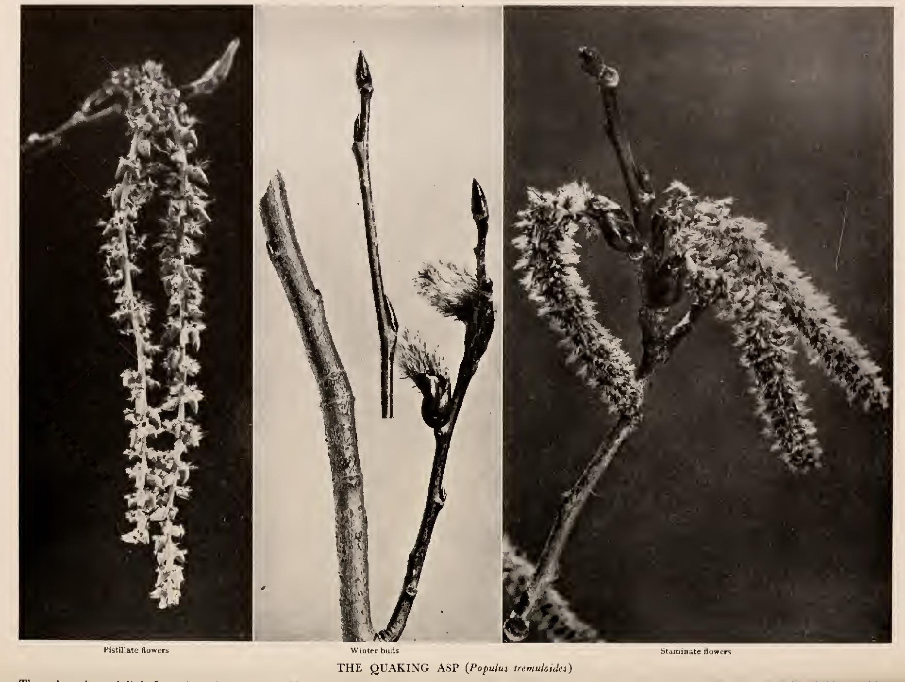 Large-toothed Aspen (Populus grandidentata, Michx.)— Narrow, round-headed tree, 5o to 75 feet high, with stout, angular branchlets, roughened by leaf scars. Bark dark brown and deeply fissured between broad ridges on old trunks; grey-green on limbs. Twigs smooth, pubescent at first. Wood soft, weak, pale brown; sap wood white. Buds ovate, pointed, scaly, waxed. Leaves ovate to roundish, heart shaped at base, acute, with sparse, irregular-rounded teeth; 3 to 4 inches long, 2 to 3 inches wide, thick, green, with pale somewhat tomentose linings; petioles slender, laterally flattened, 2 to 3 inches long. Flowers, April, dicecious, in pendulous catkins, 2 to 3 inches long; staminate red from anthers; pistillate green from spreading stigmas; bracts deeply cleft. Fruits, hairy capsules, 2-valved, thin walled, slender, crooked, filled with minute seeds, each with white, hairy float; May. Preferred habitat, rich, sandy loam, on borders of streams. Distribution, Nova Scotia to Minnesota; south to New Jersey, and on Alleghanies to North Carolina, Tennessee and Kentucky.