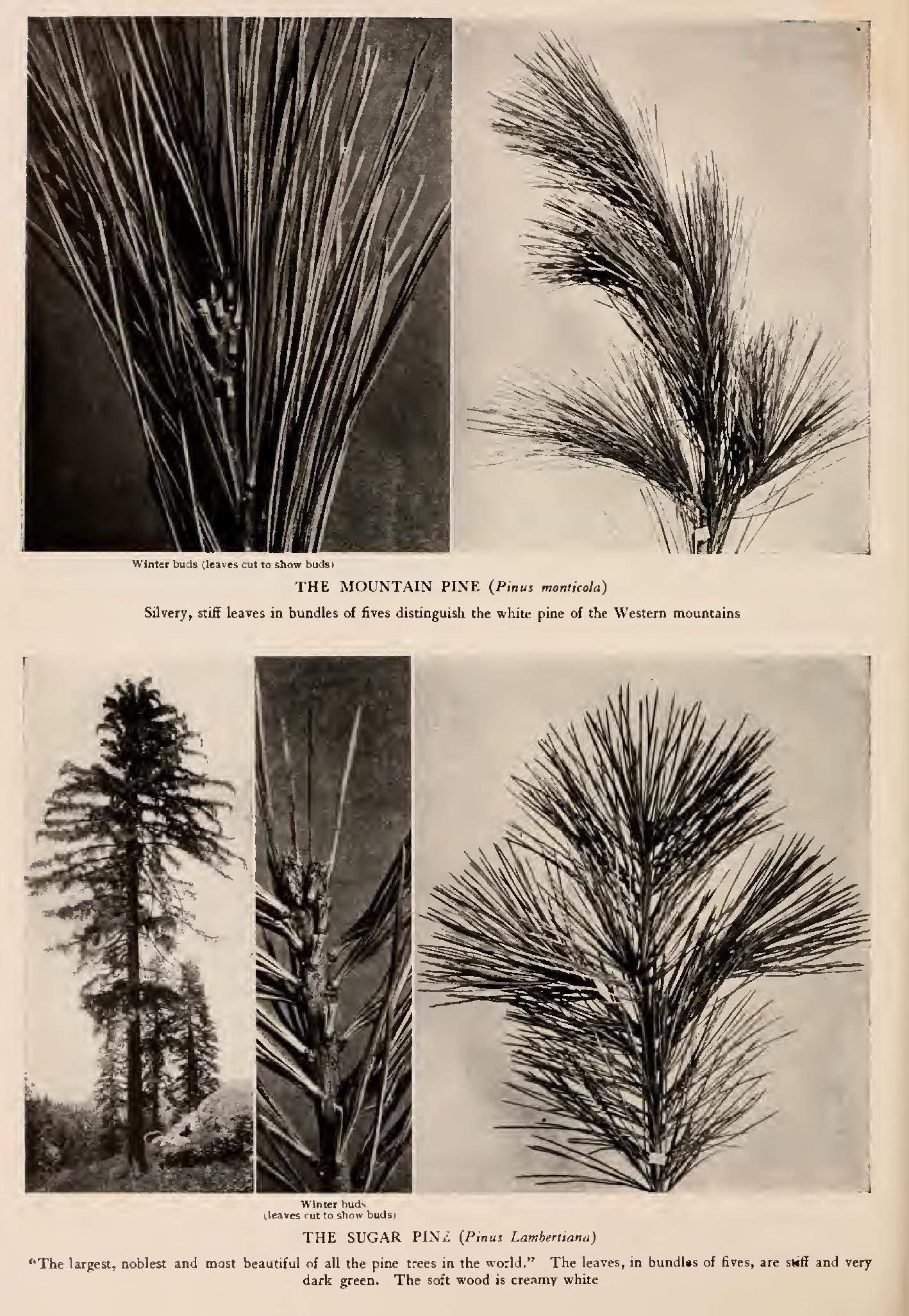 The mountain white pine is the Western counterpart of P. Strobus, which it resembles in general appearance and in the qualities of its wood. Its foliage is denser and its cones nearly twice as large as those of our Eastern white pine, with a beak on each scale that the latter species lacks.