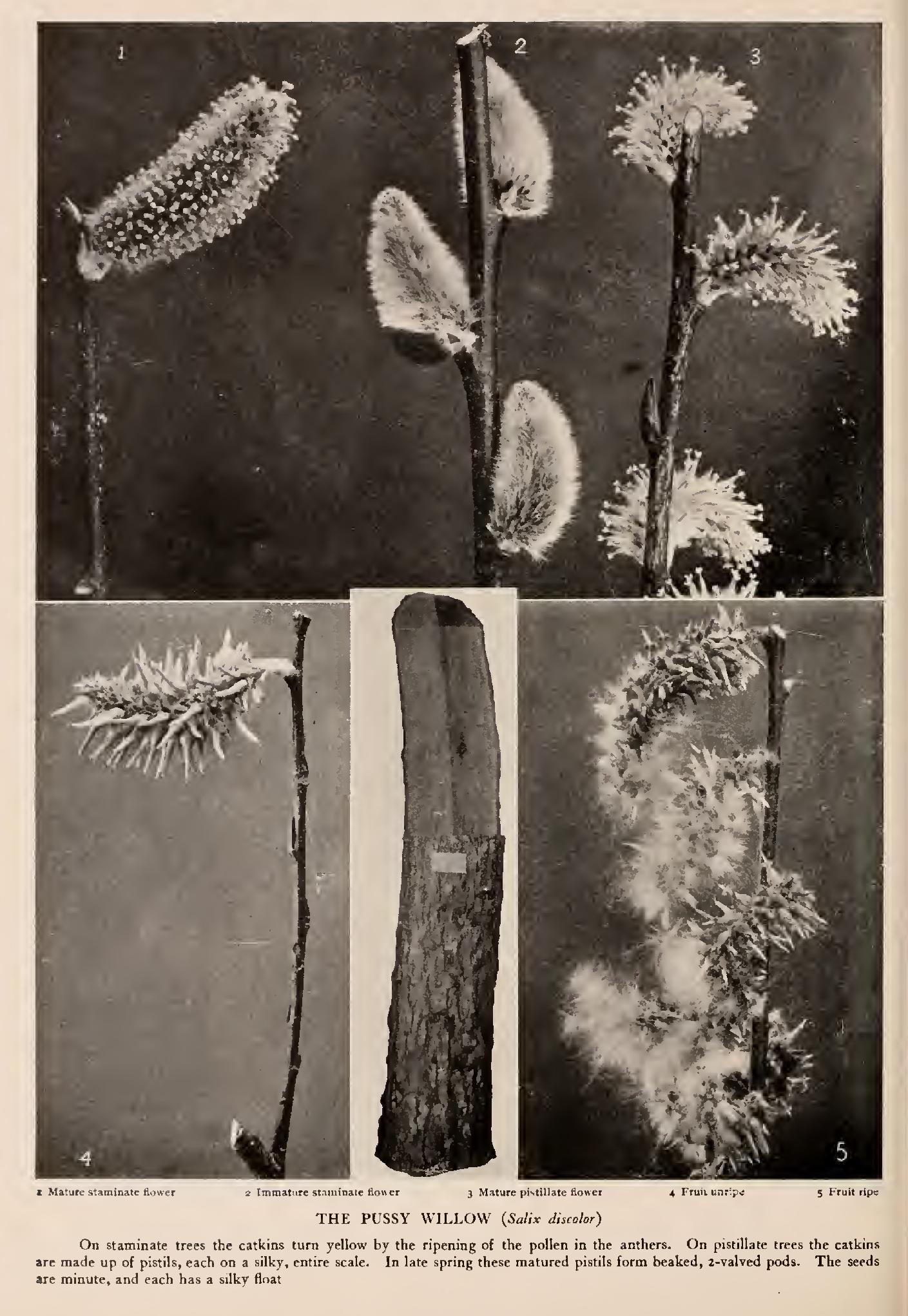Pussy Willow (Salix discolor, Muehl.)—Shrub, or small tree, to 25 feet high, with stout branchlets, purplish red with pubescent coating. Buds reddish, flattened, pointed. Leaves oblong-lanceolate, acute at both ends, irregularly serrate, often crenate, thick, 3 to 5 inches long, bright green, with pale or silvery lining; midribs broad, yellow; stipules leaf-like, half-moon shaped; petioles slender. Flowers, March, often showing earlier, before the leaves; aments silky, oval, grey, turning yellow as flowers open. Fruits aments of beaked capsules, each long pointed, on long stem, with broad, hairy scale. Preferred habitat, swamps and moist hillsides. Distribution, Nova Scotia to Manitoba; south to Delaware and Missouri.