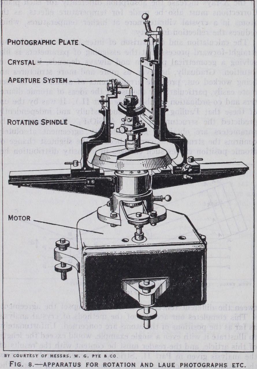 Corrections must also - be made for temperature effects, as the atoms in a crystal vibrate more at higher temperatures, which reduces the reflection The calculation and comparison of intensities is a lengthy but straight-forward process, but the assigning of parameters is like solving a geometrical problem and always depends, in part, on intuition. Gradually, however, as more and more structures are being worked out, probable arrangements of atoms can be seen more easily, particularly by the use of the ideas of atomic diame ters and co-ordination numbers (see Part II.). It was by the use of these that Pauling and West successfully and independently predicted the structure of topaz Al2SiO4F2. But however the parameters are obtained, good intensity agreement absolutely confirms the structure as correct because the slightest change of atomic position causes such changes in intensity distribution be tween the different reflections as to wholly upset the agreement.
