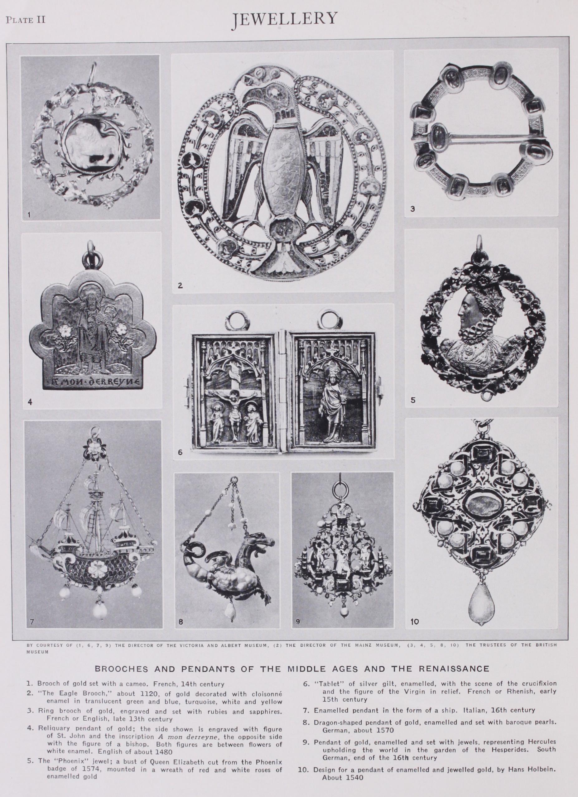 HISTORY OF EUROPEAN JEWELLERY The Empire of Rome, which had extended to the Rhine, the Danube and the Scottish frontier, and the trade of Rome, which had passed beyond these limits through Bohemia to the northern countries, left behind them a tradition so strong that it long outlived the Roman empire itself. In all this region the form, technique and decoration of jewels were influenced by Roman usage. The use of gold filigree remained general; and the varied Roman fibula forms became the basis of yet more complicated brooches. The most important development was in the use of thin slices of garnet set like enamel in metal cells (Plate A 2, 4, 7, 8), a technique ultimately derived from Egypt and probably transmitted through the Crimea. It is represented in the great 4th-century treasure found at Petrossa, 6o m. from Bucharest, and appears to have been in use nearly all over Europe between the 3rd and 8th centuries A.D. At the same time under Byzantine in fluence cloisonné enamel (see ENAMEL) was used for exceptional pieces, such as the famous Alfred jewel (Plate A, 1-3). This com mon tradition, however, was modified by each of the great Euro pean tribes into a style characteristic both in design and technique. Thanks to the general custom of burying their jewels with the dead these types of jewellery are well represented in European museums.