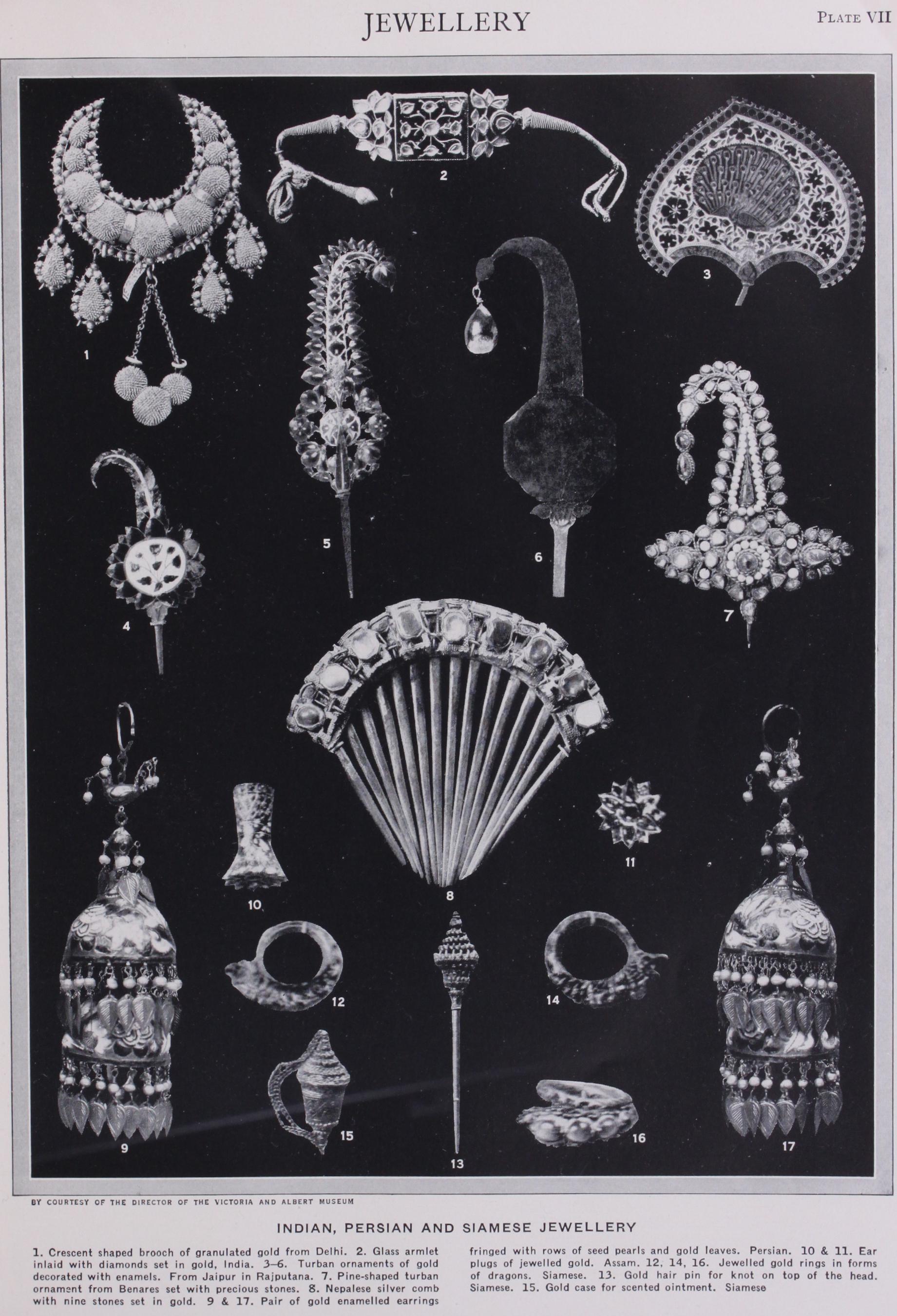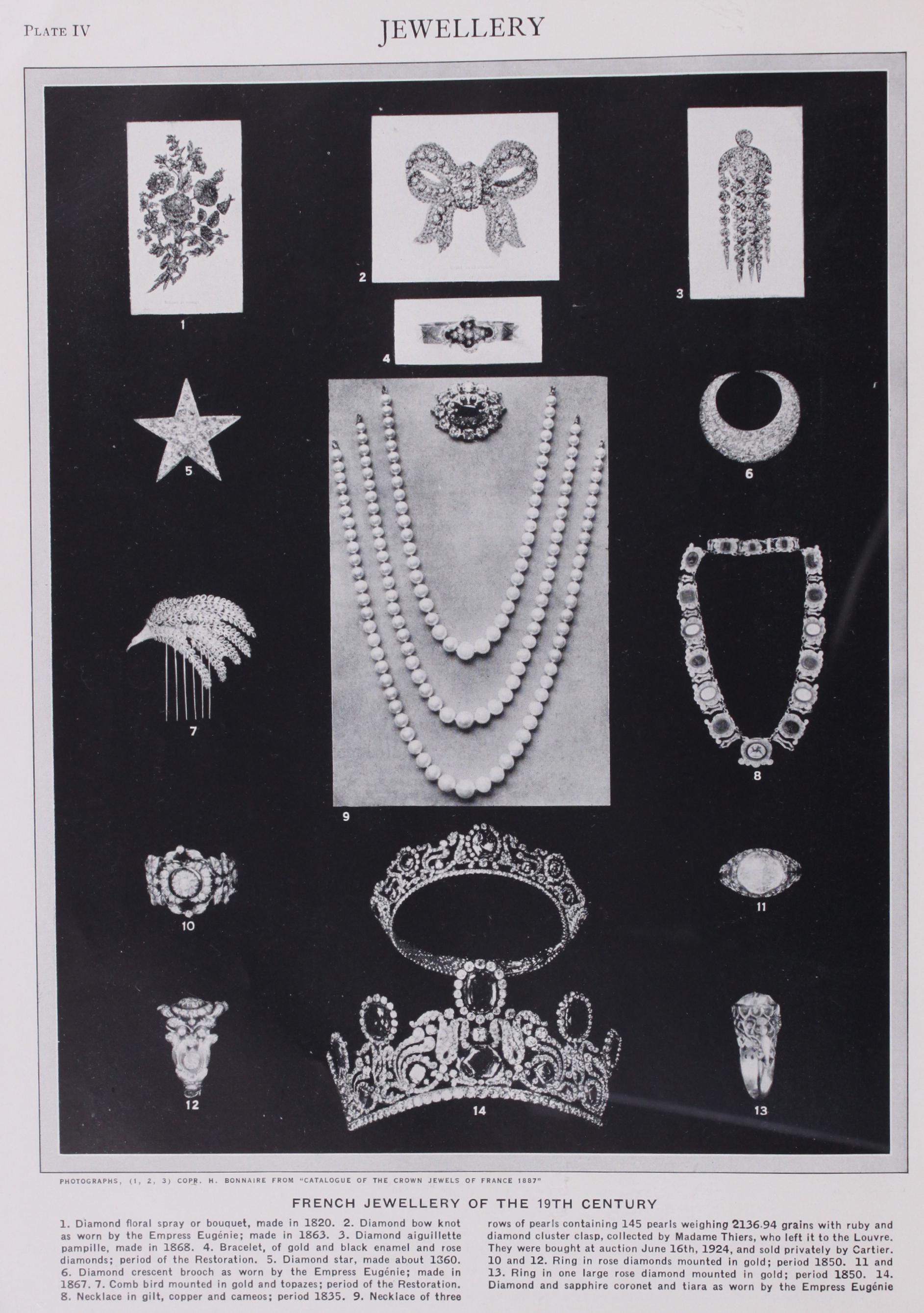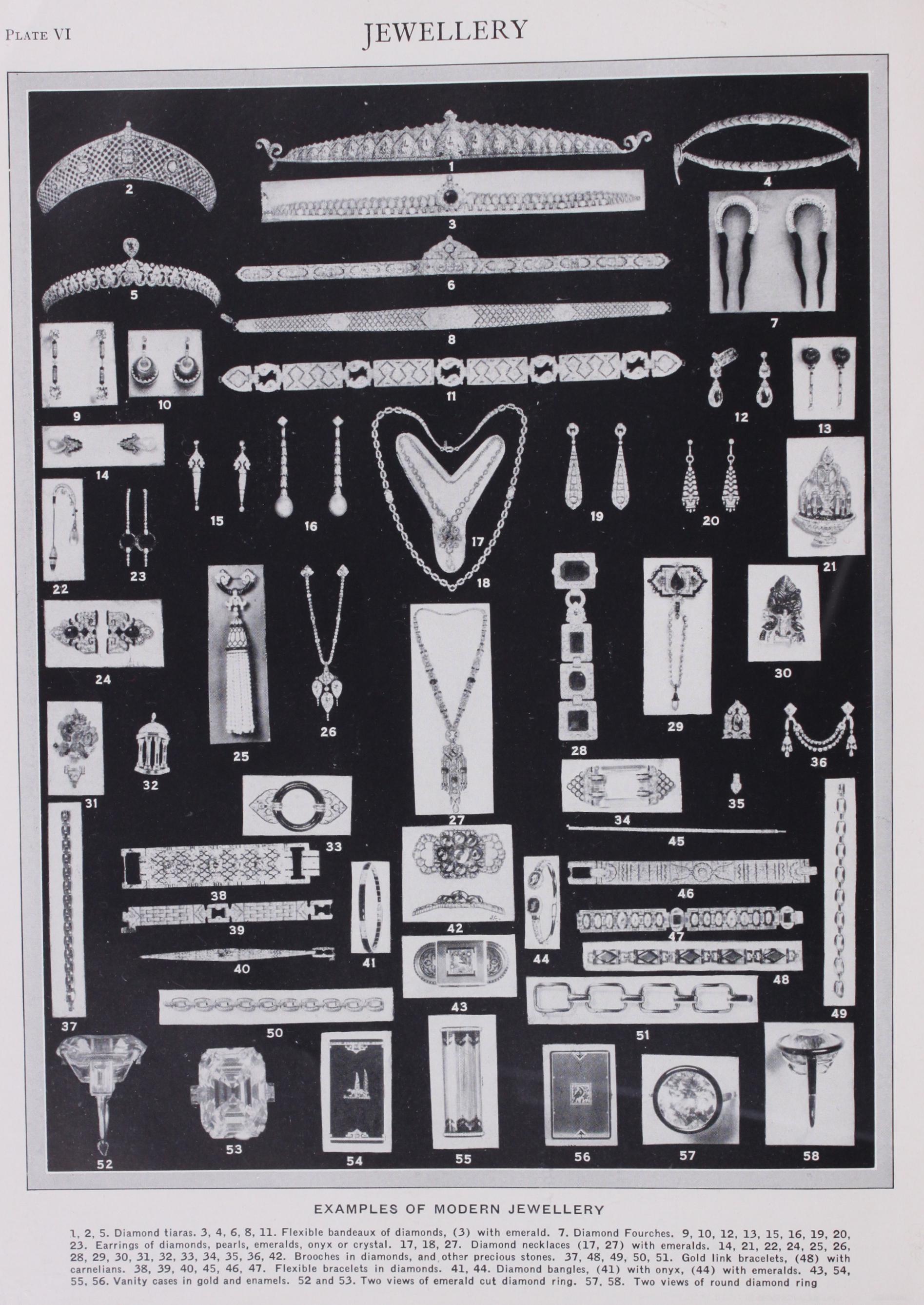 no longer be worn on the neck because of the fashion of strings of pearls, were worn on long chains, hanging below the decol letage. The great quest of pearls took European jewellers to India, from whence they brought back emerald beads, until then worn almost exclusively in Indian jewels, and engraved emeralds of all shapes became a factor on the stone market of Europe. The dominating note of the jewels at the end of this period was the combination of diamonds and black onyx.