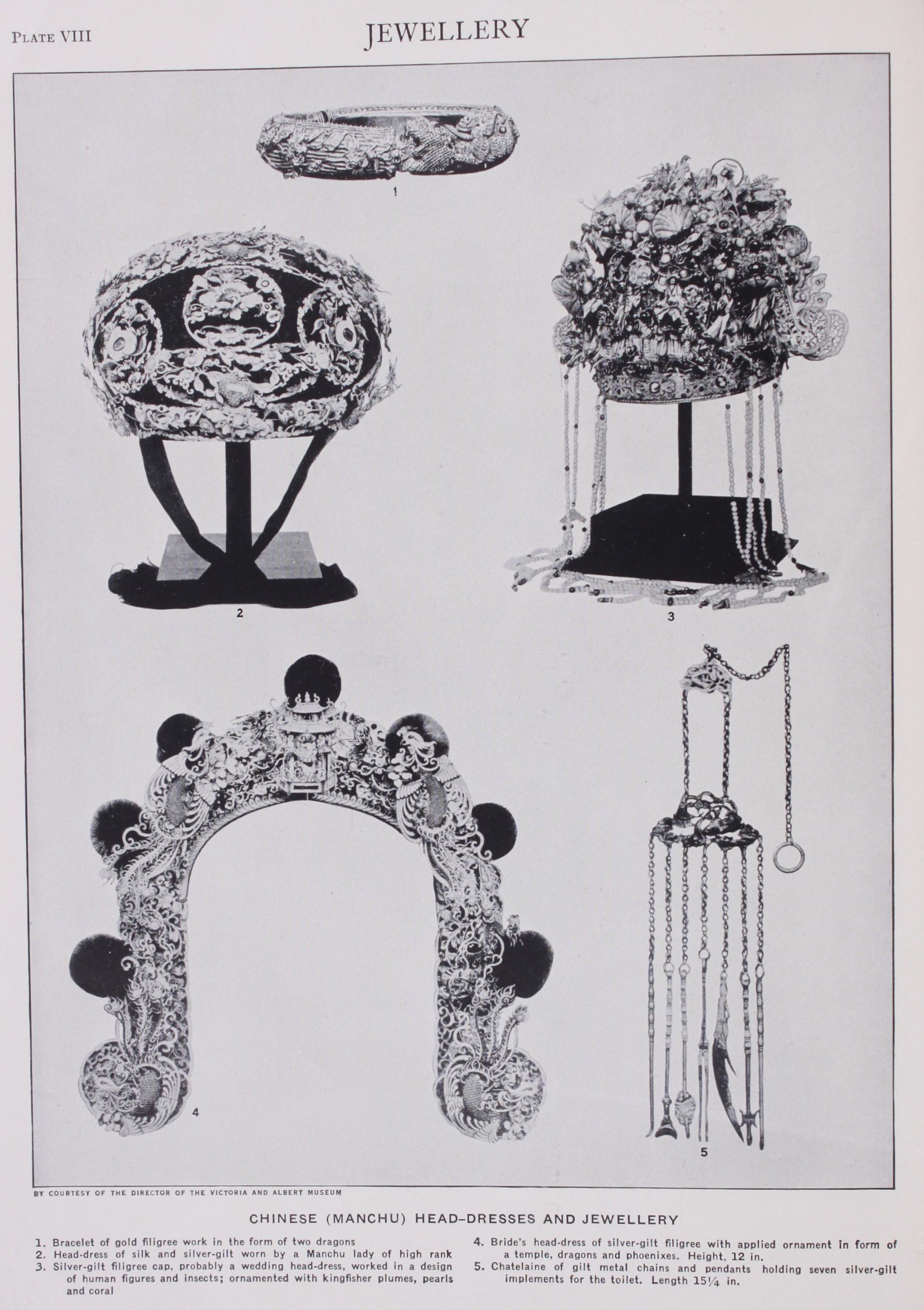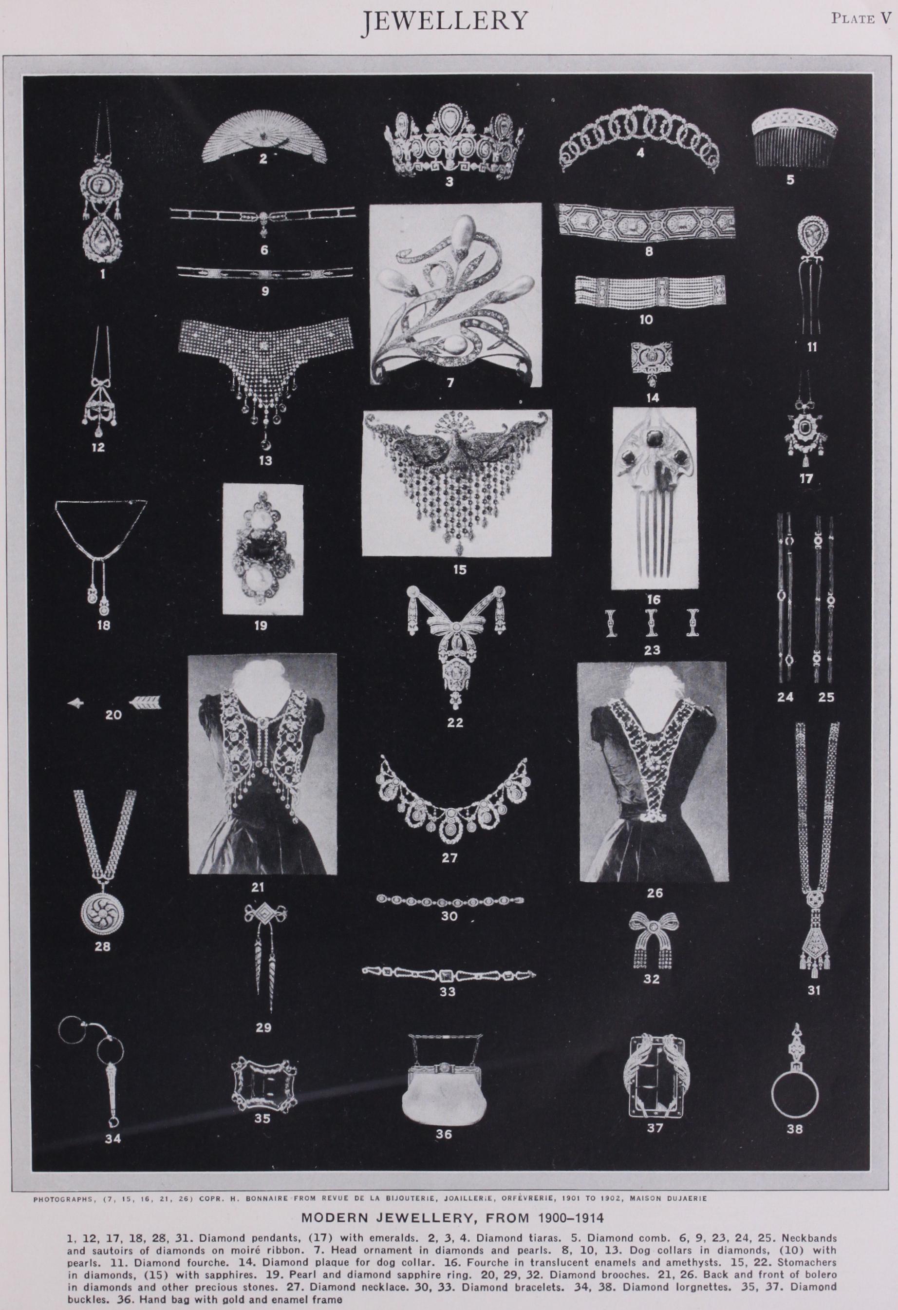 A trimming revived from the 18th century was the velvet rib bon worn at the top of the neck with a small pendant hanging in front. These ribbons were edged with diamonds set on a mounting of platinum covered by black velvet. The fashion of the narrow velvet ribbon was followed by that of the jewelled plaque de con occupying the front of the neck, worn either on a wide velvet ribbon or else attached to a number of rows of pearls clasped tightly round the neck. This again was followed by the diamond dog-collar.