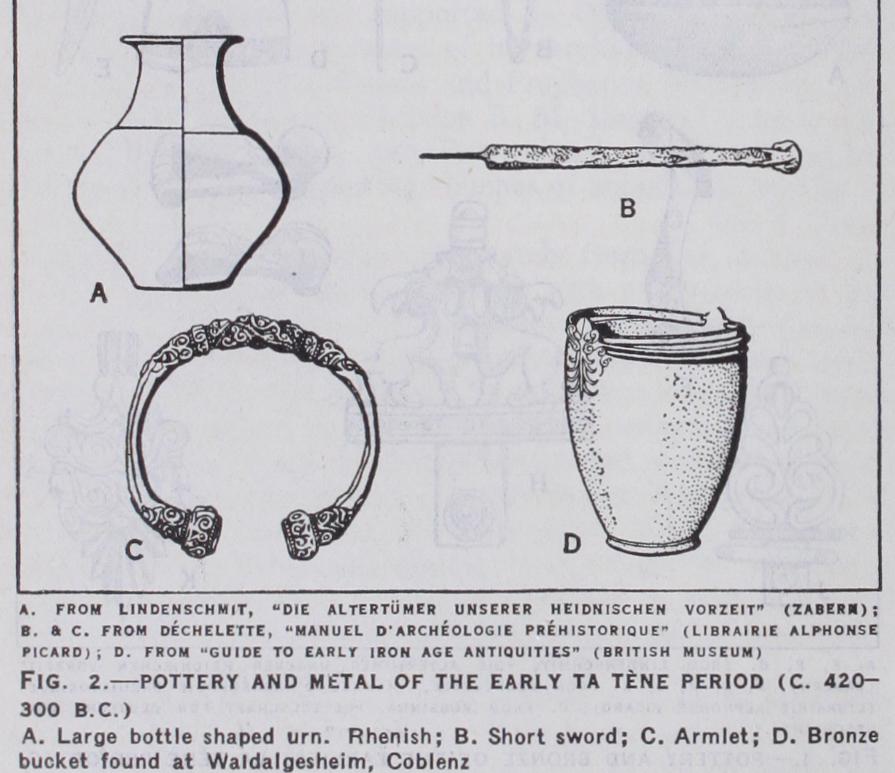 Phase B.—The Early La Tene period reveals a greater uni formity of culture than phase A and embraces a wider area. We find it in Britain, and in the provinces immediately north of the central German mountain-chain. To the east, it spread beyond Budapest ; to the south, into Switzerland and Italy. Associated finds in La Tene B graves in Italy show this phase to have ended c. 30o B.C. The rite is inhumation. Cemeteries of flat-graves take the place of the isolated tumuli, although the latter persist here and there. Large bottle shaped urns occur in the middle Rhenish area (fig. 2a). Among the most important metal types are :—the shortish sword, the scabbard ending in a trefoil or open-work chape (fig. 2b), the fibula with foot bent back towards the bow, a number of torcs and armlets, the types with "buffer" or "seal-top" terminals being very characteristic (fig. 2c) ; small phallic figurines in bronze. There was a great falling off in the imported Greek bronze vessels, the bucket found at Waldalges heim (see fig. 2d) being the only new type. The earliest Celtic coins were struck in this period, which also saw the spread of the La Tene culture into Britain.