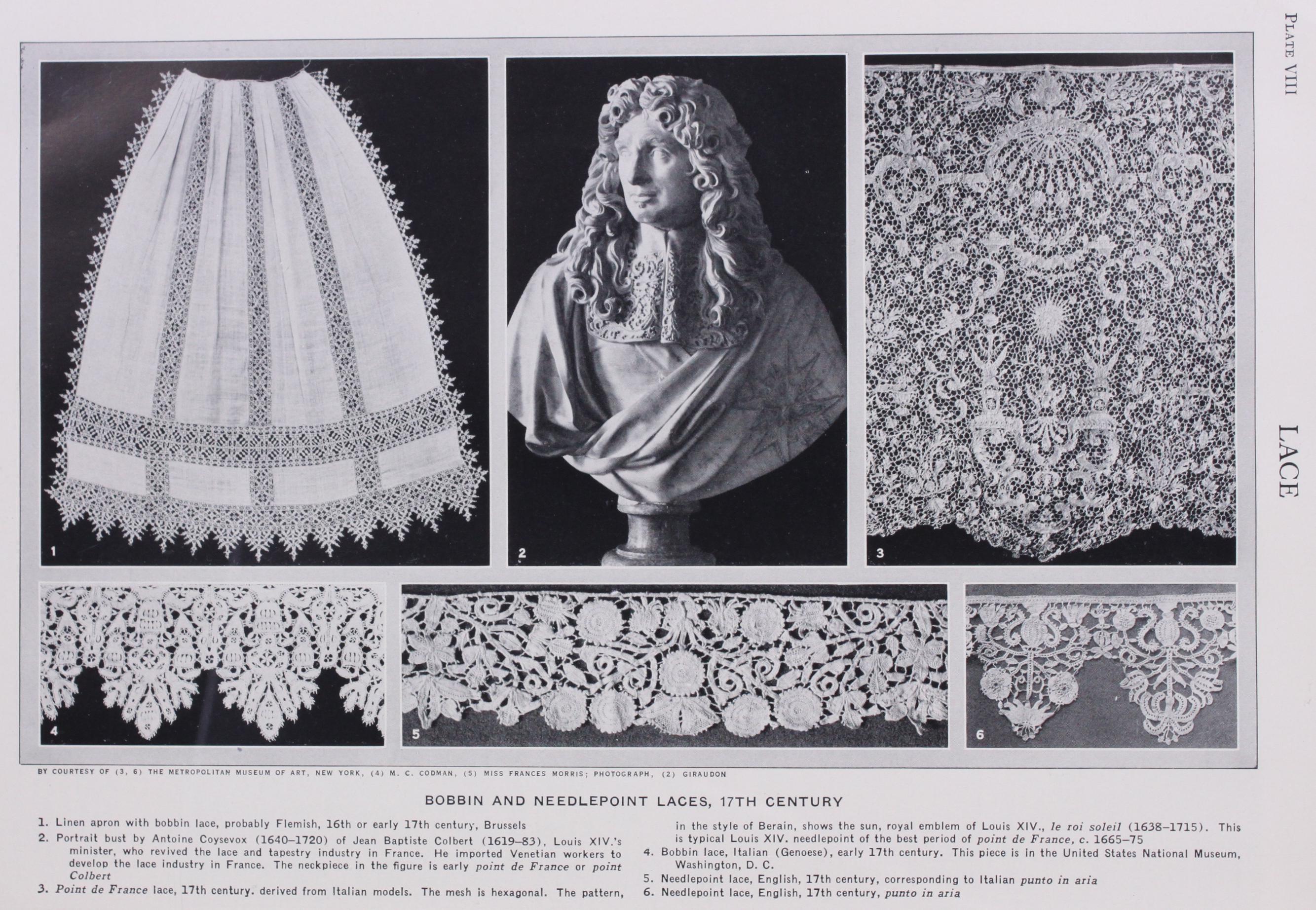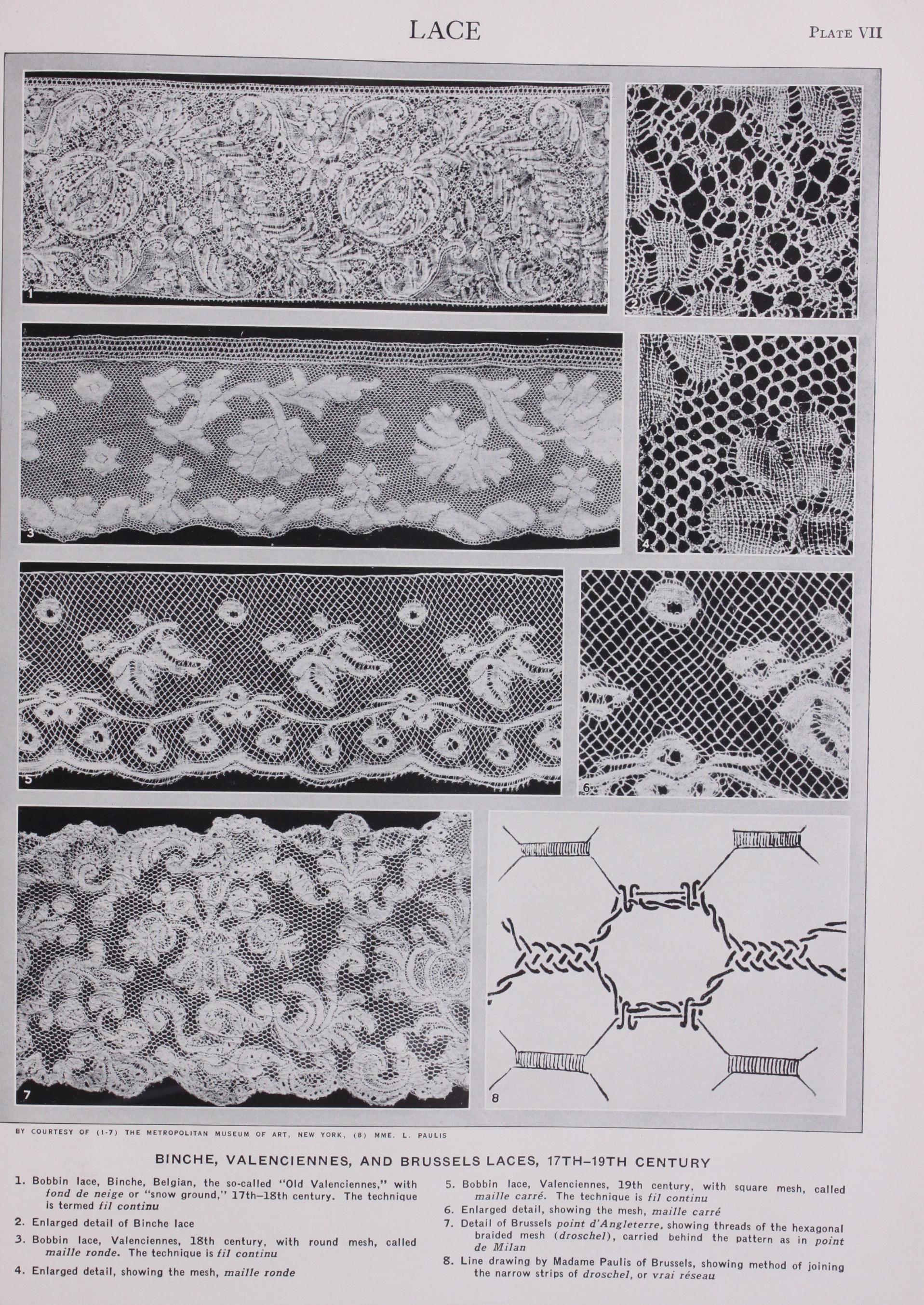 Germany.—The German presses produced the earliest pat tern books, and German lace de rived its technique from Flemish workers who emigrated at the time of the Spanish Inquisition and settled in Saxony. German tradi tion centres about the historic figure of Barbara Uttmann who, in 1561, organized an industry that developed rapidly and in time employed some 30,00o persons in the manufacture of lace work which had its origin in the net work used for miners' caps. Dresden in the i8th century was noted for its drawn-work, European fashion for the moment demanding "Dresden ruffles" and "Dresden aprons." Drawn-work of this period followed contemporary lace patterns. In North Germany bobbin laces for native head-dresses, often referred to as Niiremberg lace, resembled the Valenciennes and Mechlin types but were worked with coarser thread which resulted in a much less delicate texture. In central and southern Germany the i8th and early i9th century peasant laces, like those of Russia, are of the serpentine braid` type, coarsely worked on crudely drawn pat terns; modern peasant laces from this district are of the coarse torchon or Cluny variety. In the 19th century black silk guipure laces were made in Saxony.
